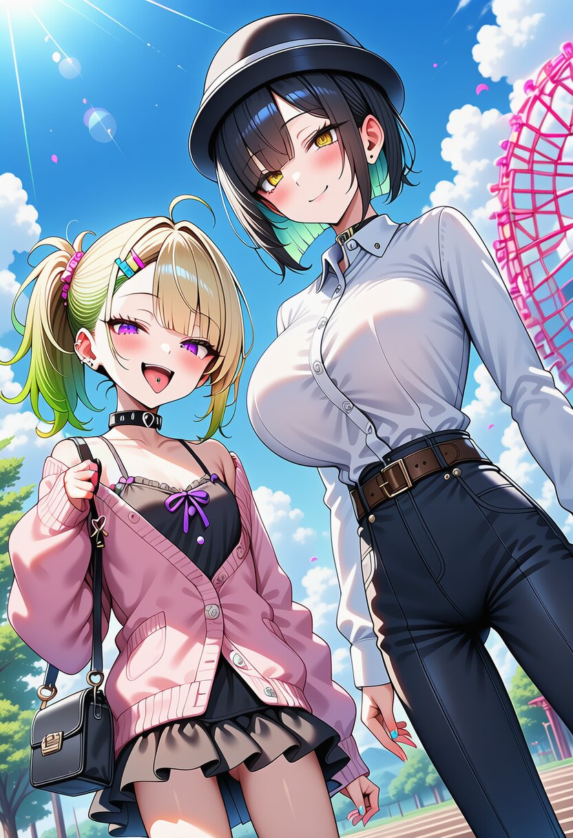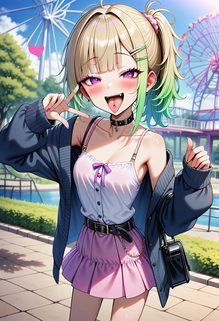 ai-generated, year 2024, anime style, 1girl, solo, kawaii posing, midday, outdoor, in amusement park, dynamic angle, masterpiece, best quality, ultra detailed, perfect fingers, high resolution, absurdres, perfect anotomy, detailed background, unity 8k wallpaper, location, very aesthetic, masterpiece, no text
