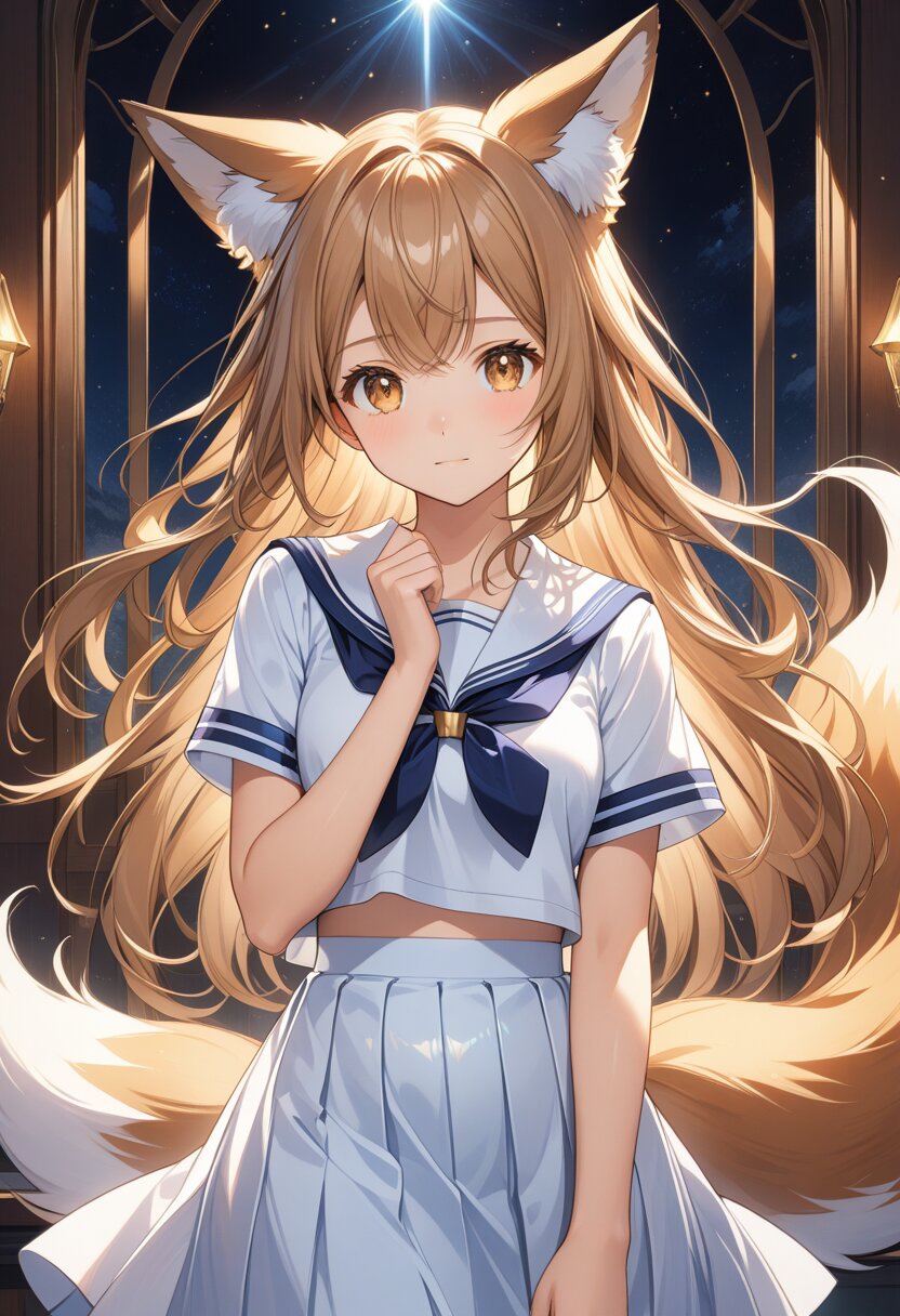 (high resolusion,illustration,ultra detailed 8k art,extremely detailed CG,official art,clothes reflecting light,detailed shiny skin,detailed background:1.3), ((highly detailed beautiful face and eyes),anime_style, fox_ears, girl, light_brown_hair, double_eyelids, long_eyelashes, fluffy_tail, sailor_uniform, long_skirt, loafers, soft_lighting, expressive_eyes, delicate_features, clean_color_palette, gentle_atmosphere, natural_pose