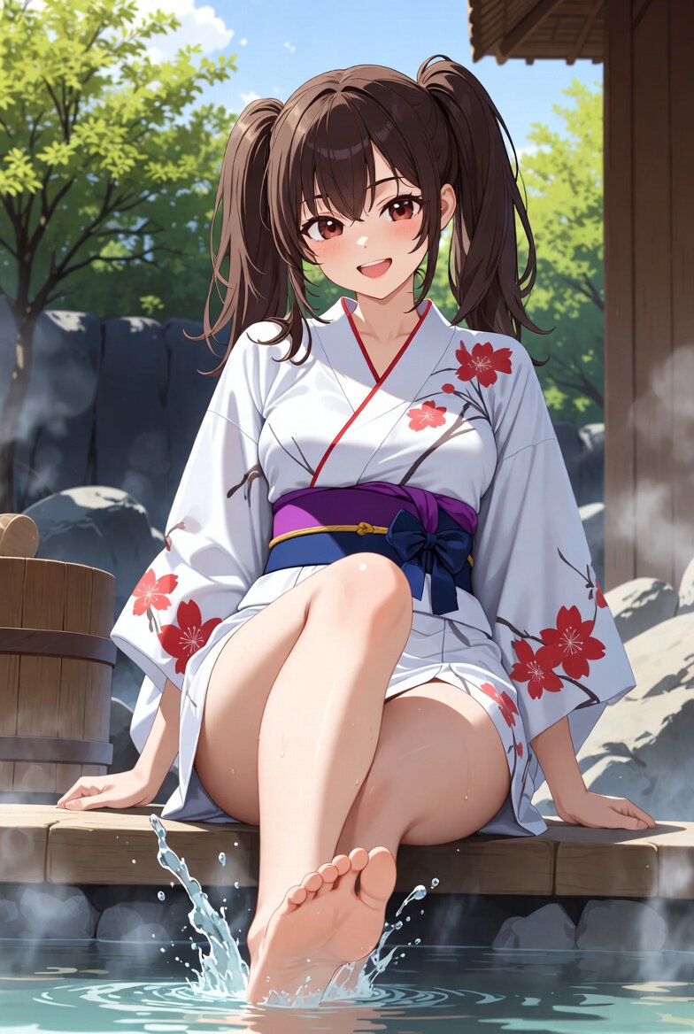 若い日本人女性、22歳、笑顔がとても可愛い、大きな自然な笑顔、歯を見せてはしゃいでいる、浴衣姿、白地に赤い桜模様の浴衣、短めの丈の浴衣、膝上くらいの長さ、紫と紺の帯、大きなリボン結び、露天風呂の縁に座って片足を湯船に勢いよく入れて水しぶきを大きく上げている、楽しそうな表情、湯気立ち上る温泉、木の浴槽、昼間の屋外露天風呂、明るい日差し、背景に緑の木々と空、リアルフォト、超高画質、詳細な肌の質感、自然な水しぶき、happy energetic atmosphere, masterpiece, best quality