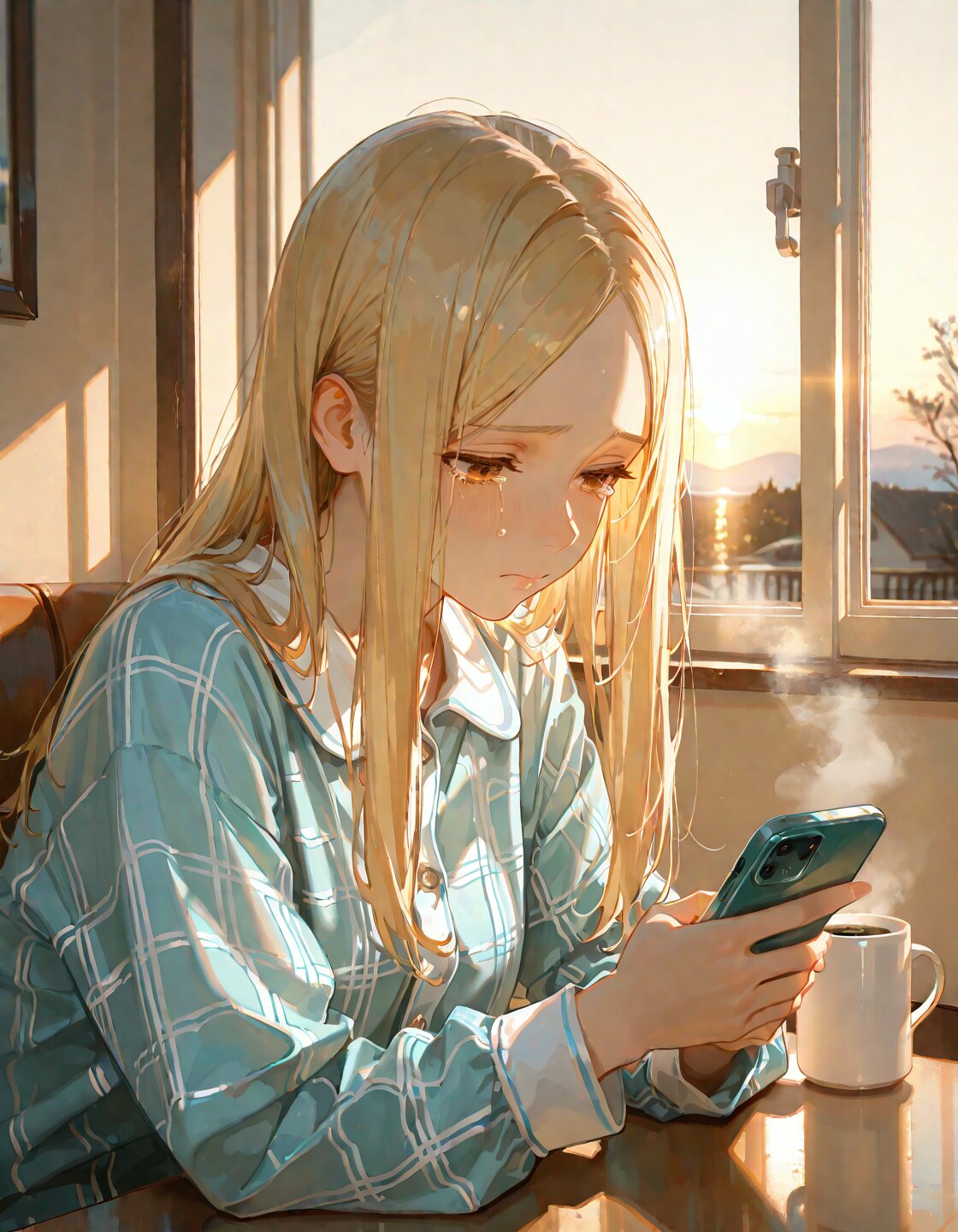 solo,1Girl,long hair,straight hair,blonde hair,(forehead:1.3),(center parted bangs:1.3),amber eyes,delicate face,delicate hair,beautifully detailed hair,defined detailed face,delicate face,beautiful detailed eyes,catchlight in eyes,masterpiece,best quality,insanely detailed,beautiful,16k,photorealistic, sitting alone in a small sunlit room,sad,lonely,worried,disappointed,heartbreak,with tears in eyes,a sorrowful and hesitant expression,wearing casual pajamas or loungewear,in the early morning,soft light coming through a window, holding a smartphone,looking down,coffee mug cup untouched on the table,quiet and melancholic mood,shallow depth of field,soft morning shadows,emotional atmosphere,A quiet residential area outside the window,hazy atmosphere,melancholic atmosphere,sunrise,bloom