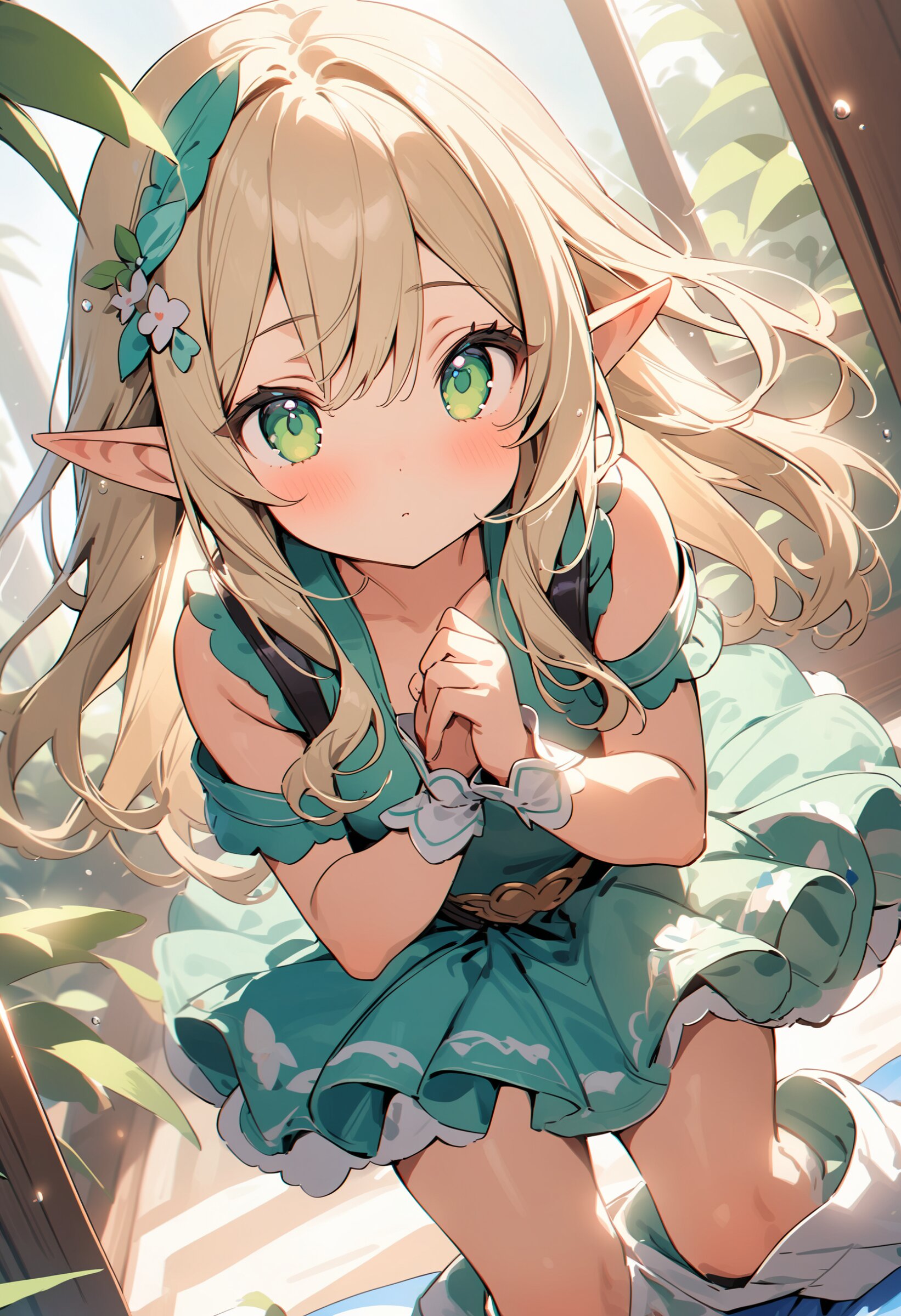 ((masterpiece)), ((best quality)), ((kawaii)), cute, (lovely), ((extremely detailed)), (beautiful), dynamic angle, a cute girl, 1girl, solo, ((elf)),beautiful blond hair, beautiful green eyes, ((beautiful eyes)), long hair, fantasy clothes,
