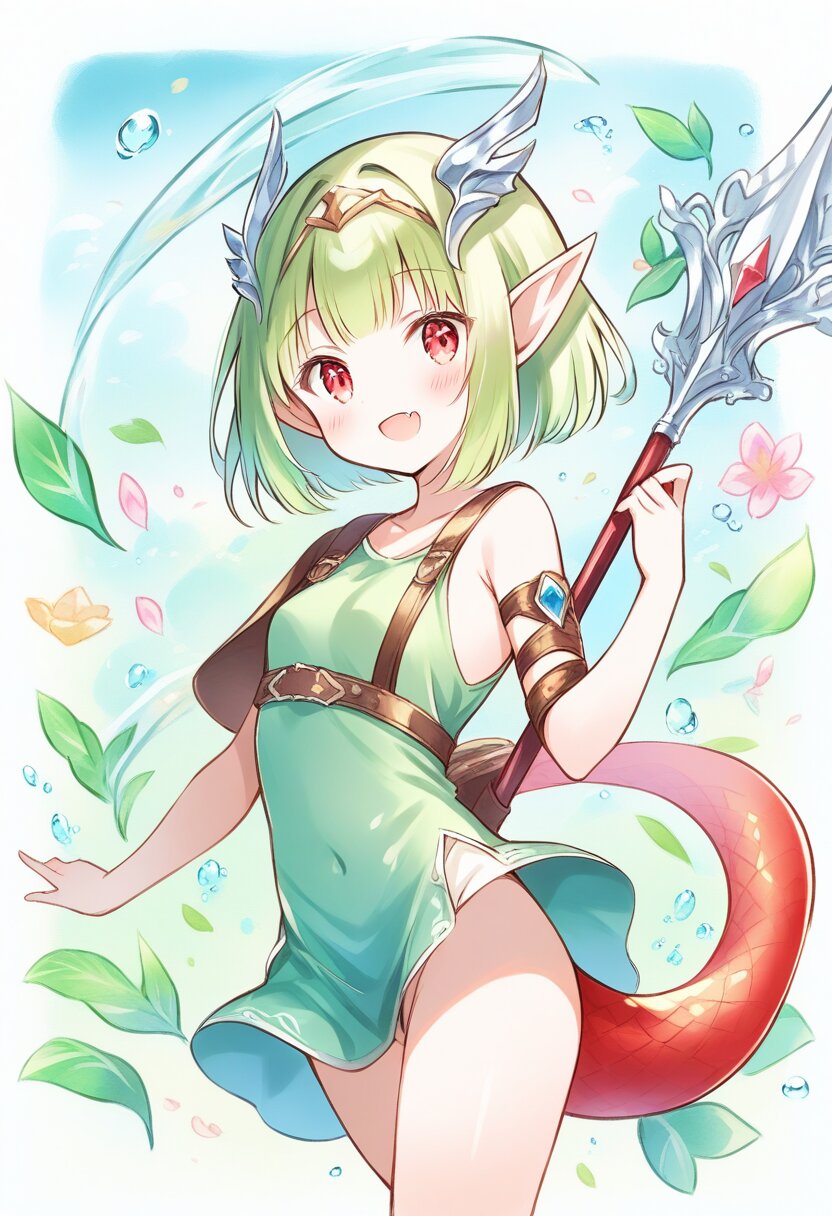 1girl, solo, chimera of elf and dragon, short vibrant green bob haircut, crimson red eyes, pointed elf ears, small breasts, petite slender body, 150cm, blush, smile, short red dragon tail, small fang, silver small dragon hair ornament, smooth skin, simple green-tinted one-piece dress, light leather armor, holding silver spear on back, spirit summoner, leaf shape wood elements, water drop elements,