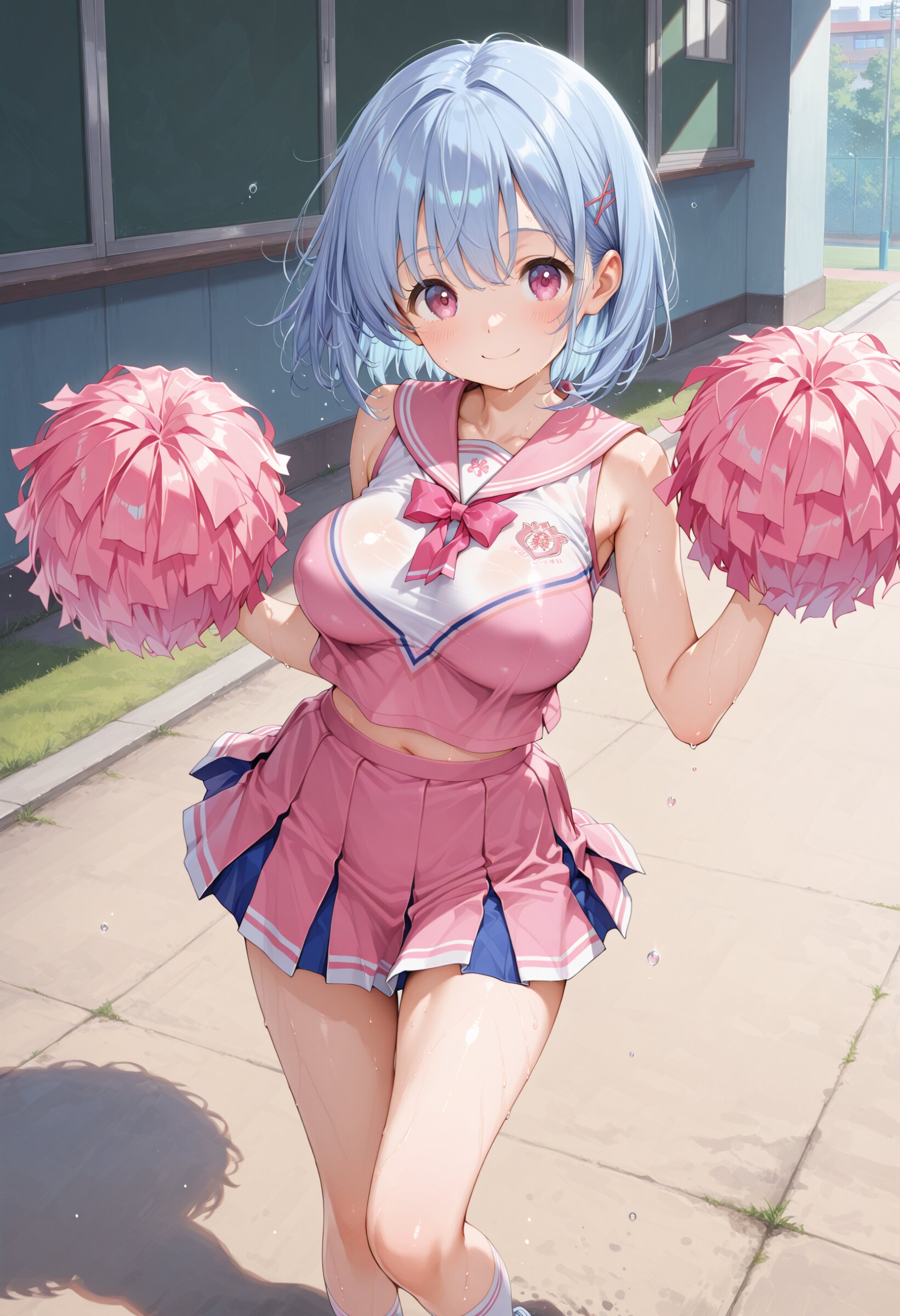 masterpiece, best quality, amazing quality, general, fine detail, official art, 1girl, loli, cheerleader, light blue hair, pink sailor collar, pink sailor uniform, sleeveless, big breasts, perky breasts, impossible clothes, midriff peek, slim legs, school ground, dynamic pose, Raise left hand high above, sweaty, smile,