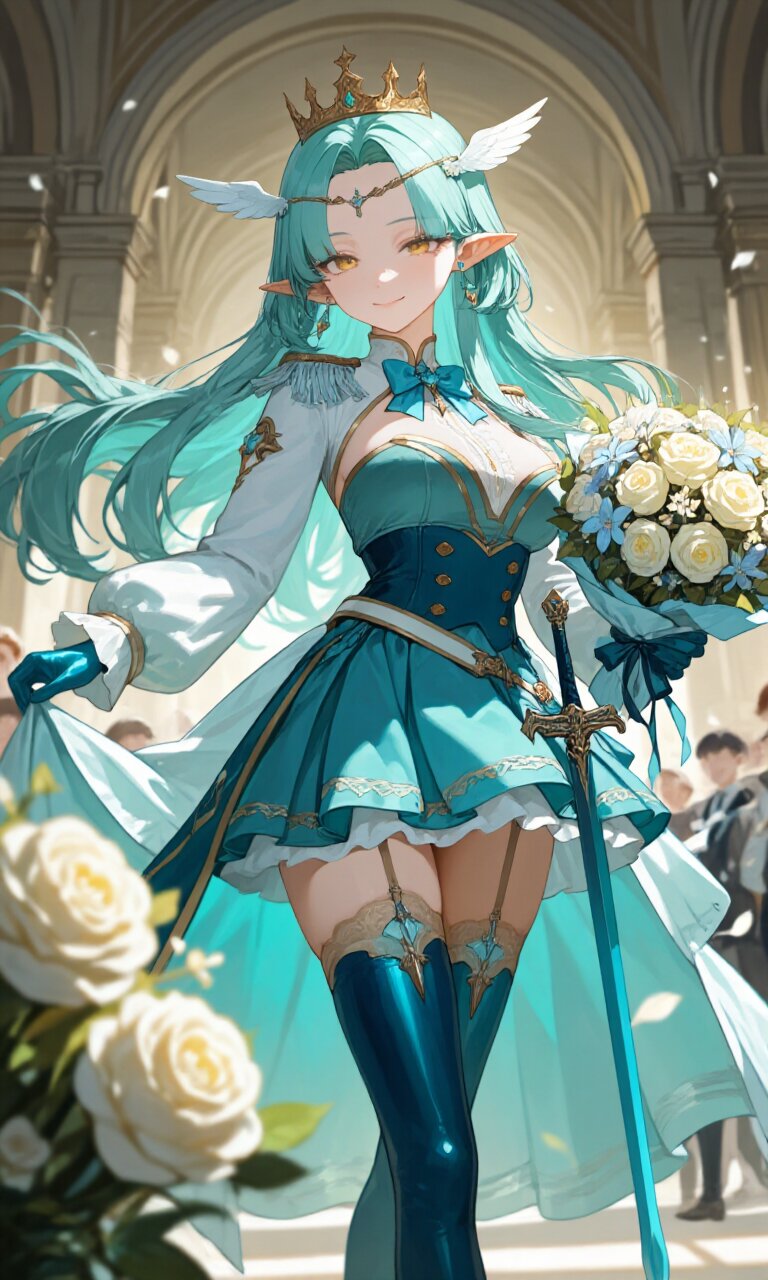 1girl, a 15-year-old princess with long aqua hair and striking yellow slant eyes, featuring (forehead:1.5) and (parted bangs:1.5). She has delicate elf ears adorned with jewelry and wears a (circlet:1.4) with a (luxurious crown on head:1.3). Her (white head wings:1.5) add an ethereal touch. She is dressed in a (Steelblue luxurious Prince costume with gold trim:1.5) with long sleeves, paired with a (luxurious mini skirt:1.3) and (Steelblue luxurious thighhighs:1.3). A (blue thin sword on waist:1.3) completes her royal ensemble. She wears (luxurious Steelblue gloves:1.2) and a (garter belt:1.2), exuding elegance. Her expression is a calm smile, happy and determined, as she strikes a cute pose (holding a bouquet in hand:1.6). The scene is heartwarming, set in a (Palace:1.2) ballroom with (Romanesque architecture:1.2), filled with lots of flowers and an elegant, dreamy atmosphere. Soft lighting enhances the romantic academia vibe as she is (surrounded by friends:1.8). The image is a masterpiece with insanely detailed face, skin, hair, and clothes, rendered in 16k photorealistic quality.