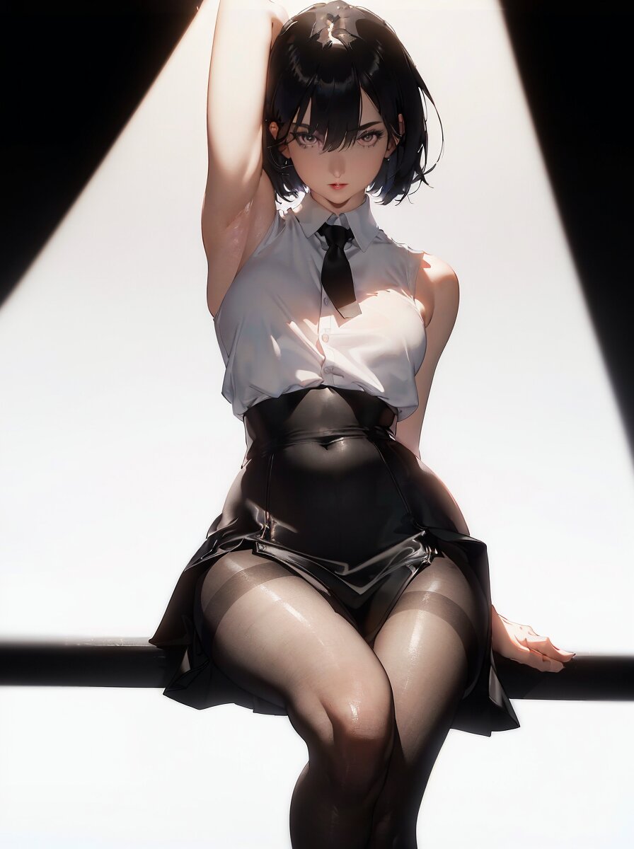 (8k,ultra high res,best quality,masterpiece:1.2),1girl,teacher,white short hair,(white sleeveless (shirt,))black leather very long skirt,high slit both sides skirt,((black pantyhose,))pin heels,close up,gleaming skin,eyes visible through hair,cinematic shadows,cinematic pose,cinematic angle,strong light comming in,