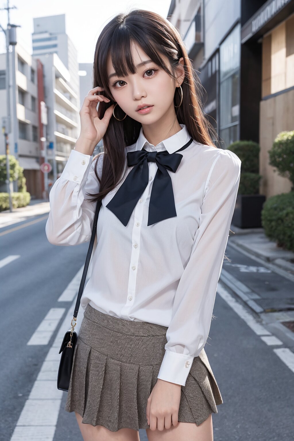masterpiece, hyper detailed, 16K, RAW photo, realistic, good hands, BREAK Japanese woman, 23yo, cute, pretty, hyper detailed face, hyper detailed eye, beautiful eye, extremely detailed, medium hair,hime cut, bangs, thin body, tall body, perfect anatomy, perfect proportions, extremely detailed body, blouse, short tight skirt, knee high socks, BREAK city background,