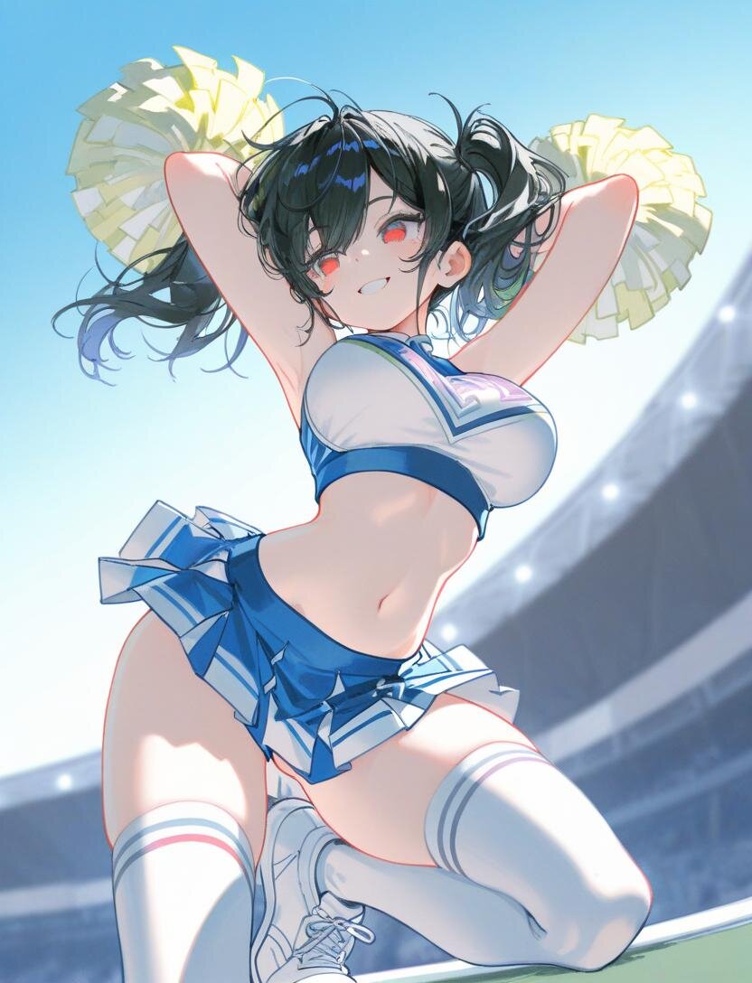 Masterpiece, Ultra HD, Cinematic lighting, High definition, Depth of field, (Blurred background), (Dramatic lighting), Top quality, Very beautiful, 8K, Simple background,1girl,loli,bishoujo,black hair,twintails,big breasts,narrow_waist,tsurime,early teen,Pose: low angle, mid-jump, one knee bent with a slight twist in the air, arms raised in a V shape, dynamic movement Outfit: red cheerleader outfit (sleeveless top + pleated mini skirt), white trim, skirt lightly fluttering in the wind, white sneakers, white over-the-knee socks, visible thigh gap Background: outdoor stadium, blue sky, rainbow in the sky, blurred spectator stands, daytime, anime-style colors