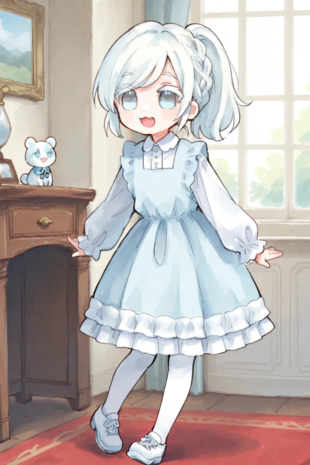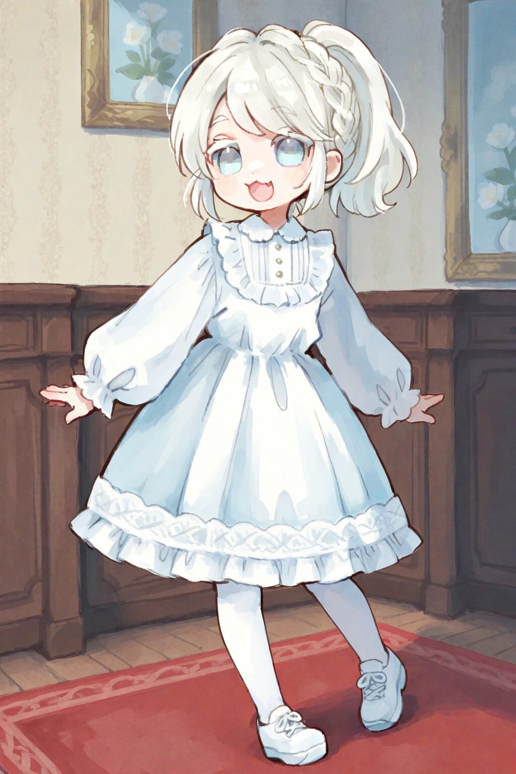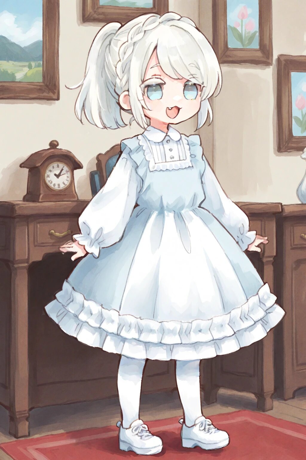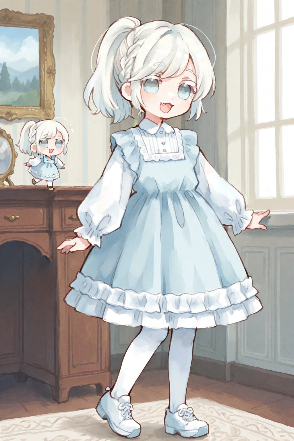 chibi, solo, 1boy, antique room, white hair, ponytail, medium hair, braid bangs, swept bangs, pale blue eyes, white colored eyelashes, :3, fang, white frilly longsleeves dress, white tights, white shoes, smile, open mouth, ultra-detailed, best quality, masterpiece, very aesthetic, watercolor painting, general