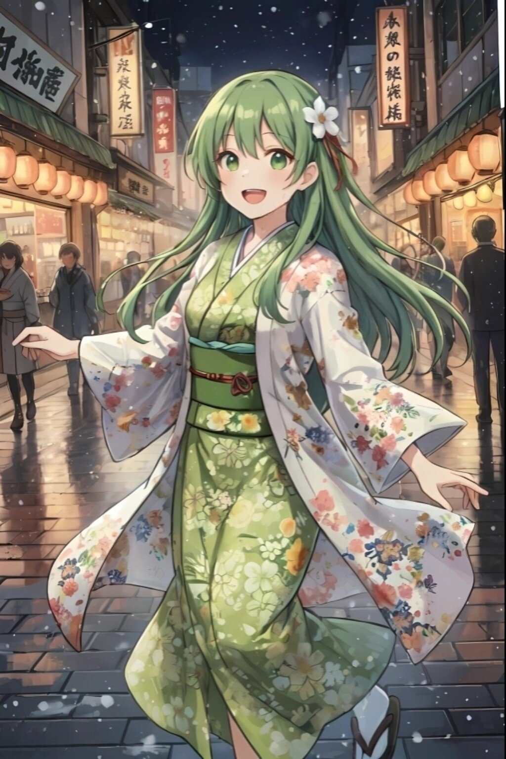 An anime-style full-body illustration of a joyful young girl with long, flowing green hair and bright green eyes, wearing a white floral silk haori over a light green floral kimono. She is happily taking dance-like steps on a wet, snow-dusted street in a vibrant Japanese shopping arcade at night. The arcade is illuminated by glowing lanterns and various shop signs. Red petals are scattered on the ground. The atmosphere is lively and cheerful, with other people in the background. The art style is detailed and colorful, with a slight gleam on surfaces.