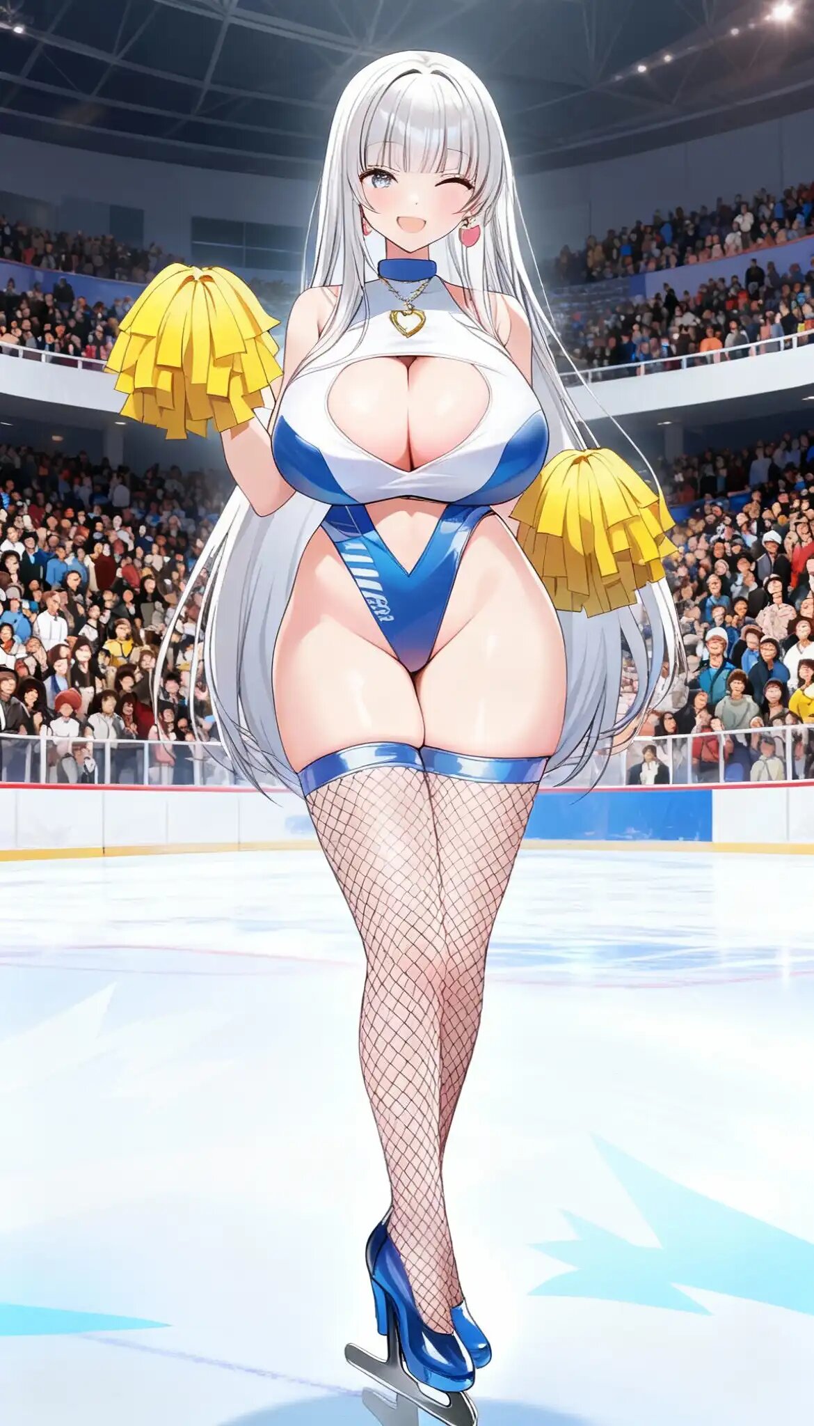 [masterpiece]++, [best quality]++, [ultra detailed]++, [8K]++, [race queen]++, [cleavage cutout]++, [cleavage]++, [full body]++,[holding pom poms]++, [hand up]++, [highleg]++,1girl, solo, [huge breasts]++, perky breasts, hanging breasts, curvy, [sleeveless]++, bare shoulders, bare arms, [fishnet thighhighs]++, [high heels]++, [legs together]++, standing, [tall]++, [long hair]++, [straight hair]++, [shiny skin]++, [shiny clothes]++, [one eye closed]++, smile, blush, open mouth, [Figure skating rink]++, [audience]++, [Standing on an ice floor]++, indoors, light,