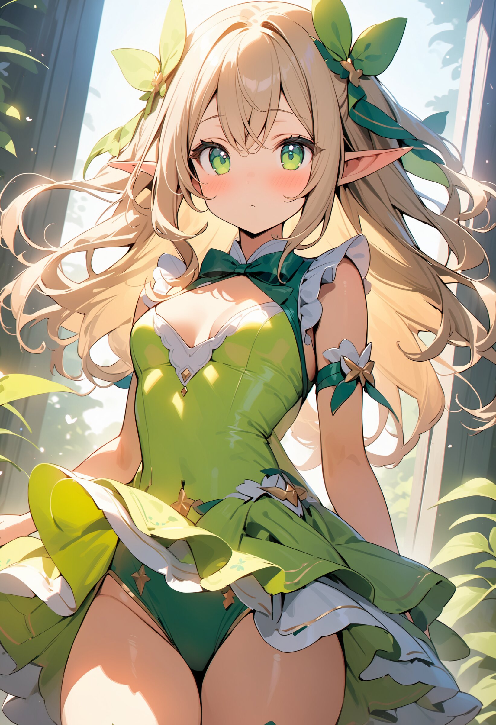 ((masterpiece)), ((best quality)), ((kawaii)), cute, (lovely), ((extremely detailed)), (beautiful), dynamic angle, a cute girl, 1girl, solo, ((elf)),beautiful blond hair, beautiful green eyes, ((beautiful eyes)), long hair, fantasy clothes,