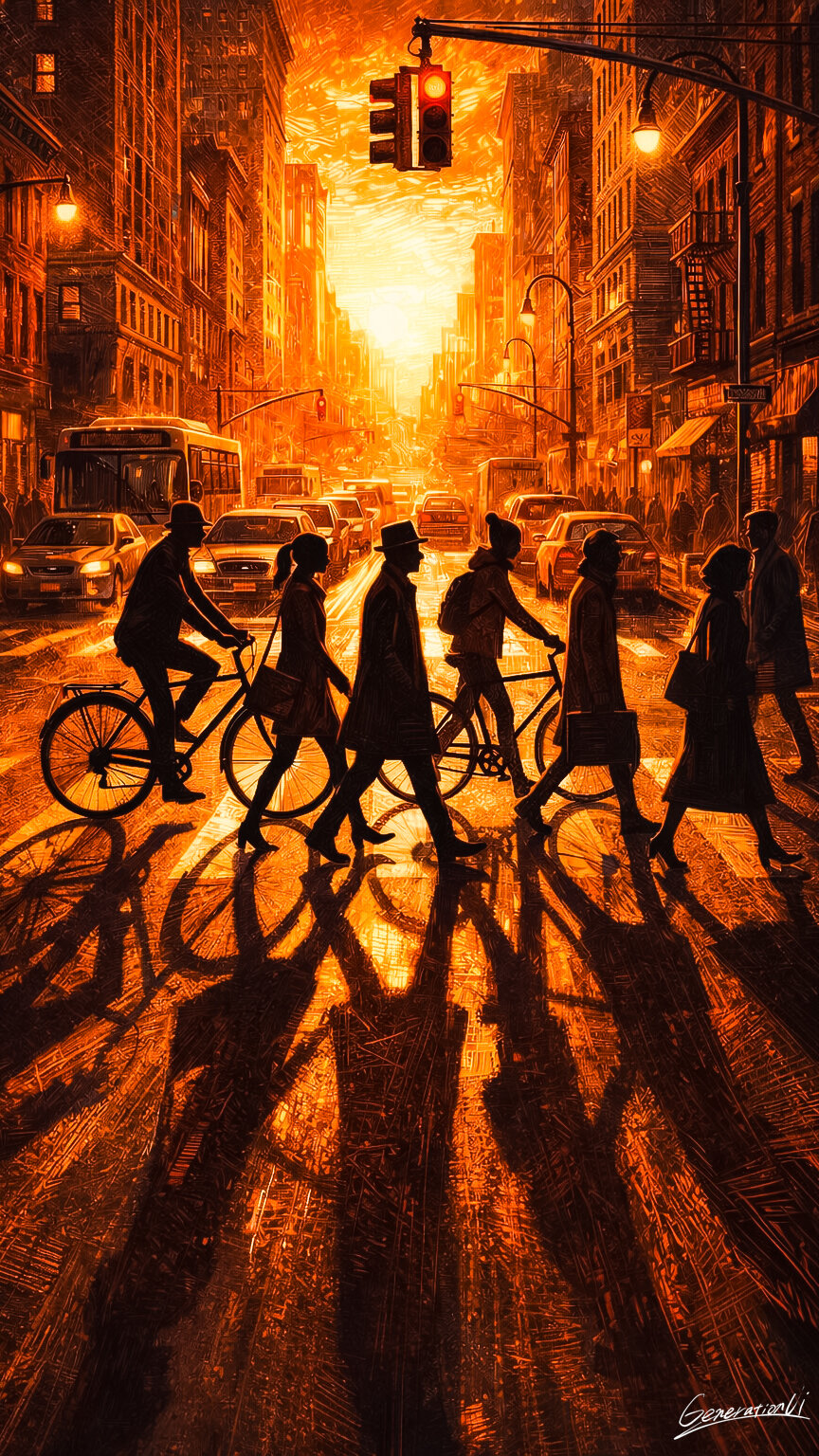 【オレンジ色の街と帰路のシルエット】