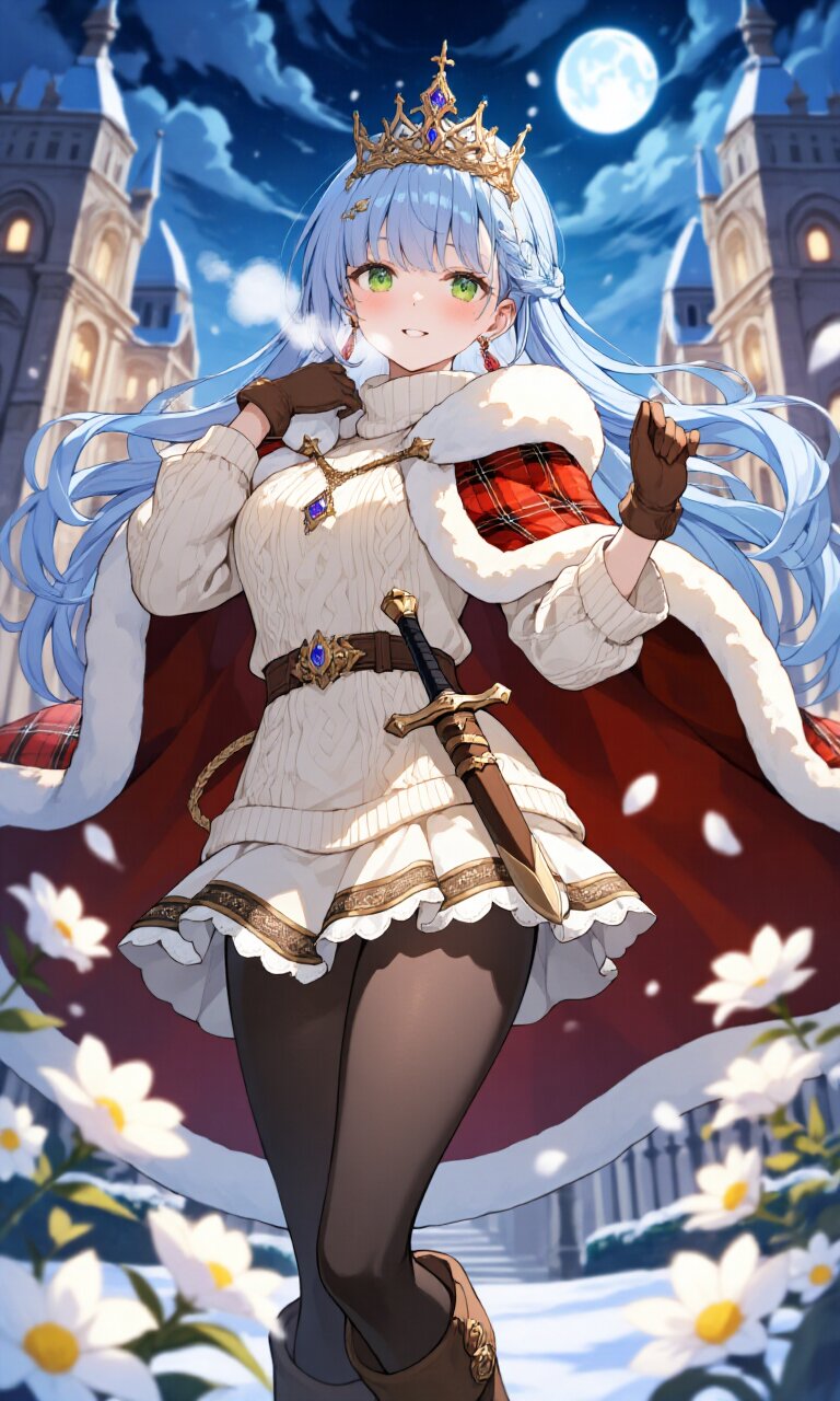 A stunningly beautiful young woman with long, flowing light blue hair and bright green eyes stands outside a grand Baroque palace at night, her delicate face framed by intricate jewelry and a (luxurious crown on head:1.4). Her fair skin glows under the moonlight, and her parted lips exhale a soft white breath from the cold. She wears an elegant (White knit luxurious Prince costume:1.6) with long sleeves, paired with a (luxurious mini skirt:1.4) and a (luxurious knit Red plaid Cape:1.3) draped over her shoulders. Her legs are clad in luxurious black tights, and she wears (Brown luxurious Boots:1.3) and (Brown luxurious gloves:1.2). A (Dagger on waist:1.3) adds a regal yet dangerous touch to her outfit. She strikes a cute pose, her cheeks adorned with ((blush)), radiating happiness and charm. The winter atmosphere is enhanced by delicate flowers blooming around her, their petals catching the soft glow of the moonlight. The background features towering Baroque architecture, with intricate details and swirling clouds in the night sky. The scene exudes romantic academia vibes, blending fantasy and elegance in an insanely detailed masterpiece.