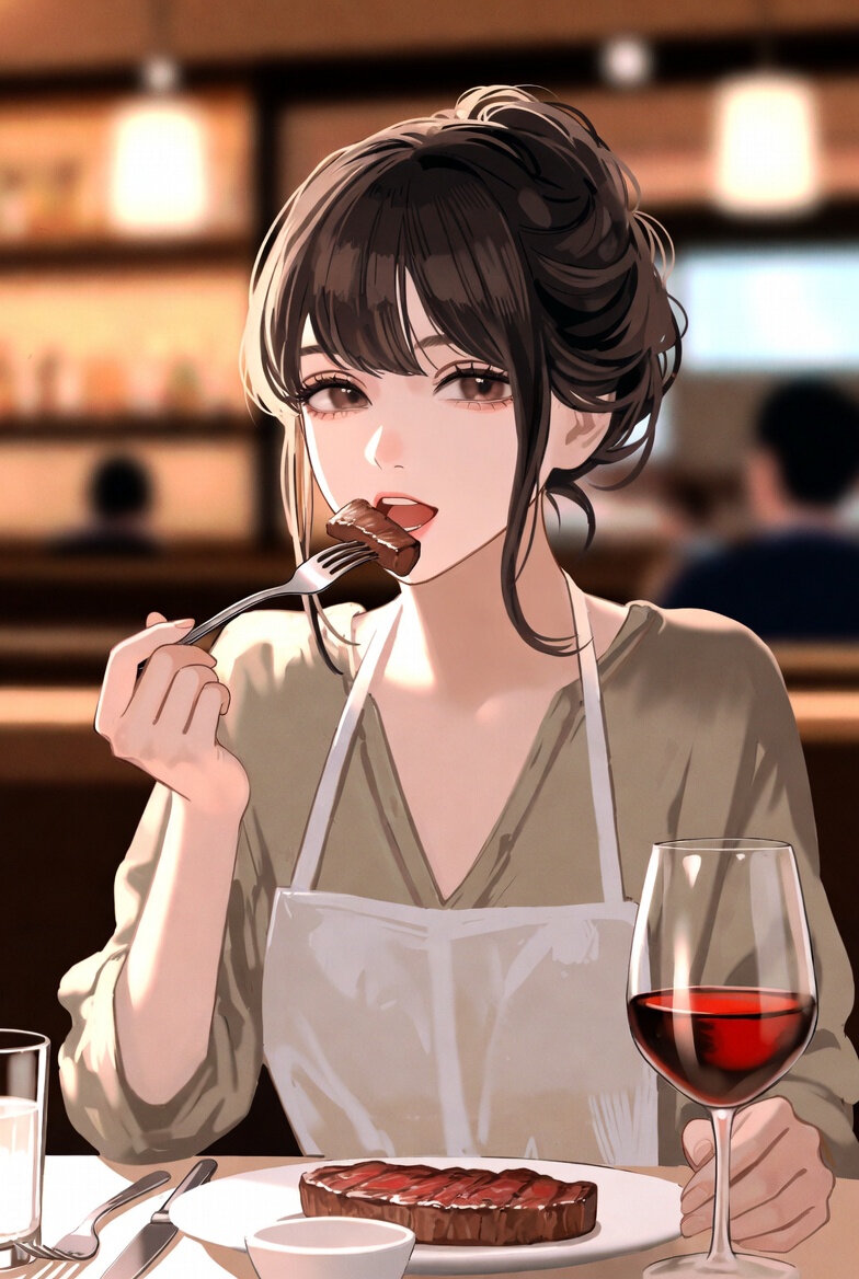 レストランで食事をしている日本人女性20代のイラスト。ステーキとワインを楽しんでいる。服装は会社員の通勤に使われるようなカジュアルな服装。汚れないように首から小さな紙エプロンを着けている。