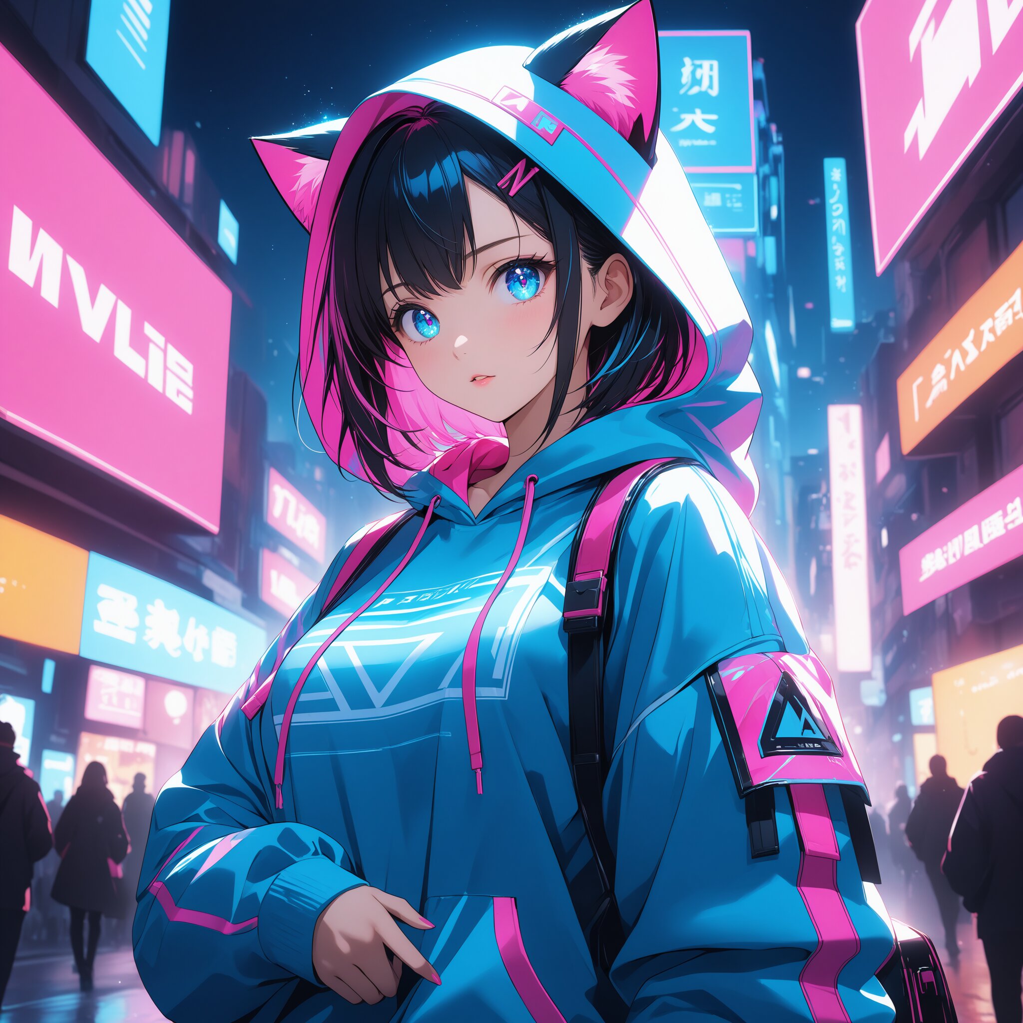 masterpiece, best quality, photorealistic, sharp focus, cinematic lighting, depth of field, beautiful composition, vibrant colors, ultra high res, 8K, highly detailed, masterpiece, best quality, very detailed, A cute anime girl with mechanical cat ears, wearing a vibrant oversized techwear hoodie, neon pink and blue lighting, futuristic street background with holographic signs, trendy anime art style, sparkling expressive eyes, dynamic pose, high contrast, colorful aesthetic, masterpiece, sharp lines.