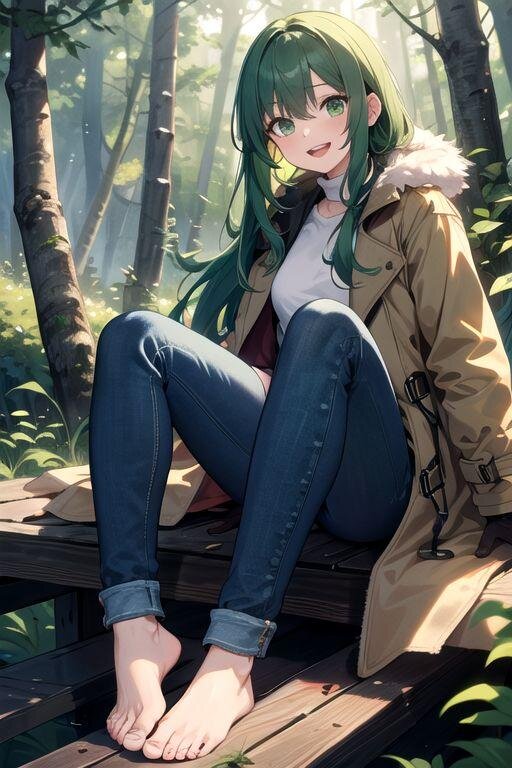 green hair, very long hair, green eyes, gloves, barefoot, (long toes:1.3), (long jeans:1.4),(coat:1.3),smile,open mouth, forest background