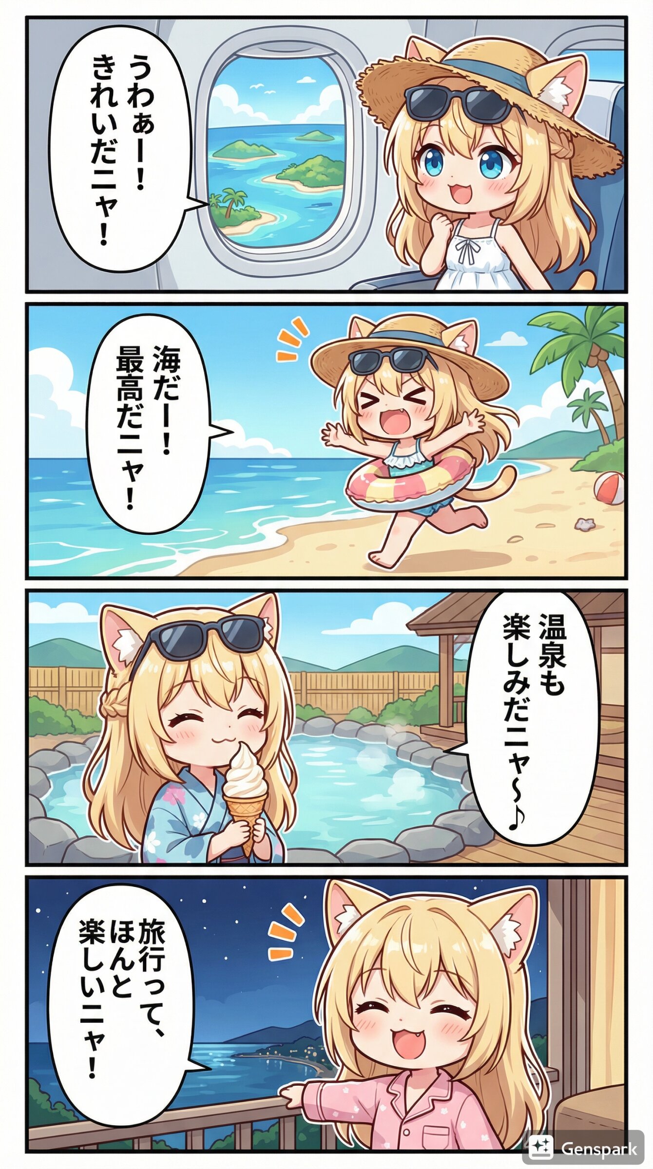 金髪猫耳娘が旅行を満喫しているユニークな短編カラー漫画を作って。 サングラスをかけて、麦わら帽子を被ってご機嫌な様子。 セリフはすべて日本語。右から左へ読むことを前提としたセリフ配置。 キャラの衣装は場所に合わせて必要に応じて変更して。