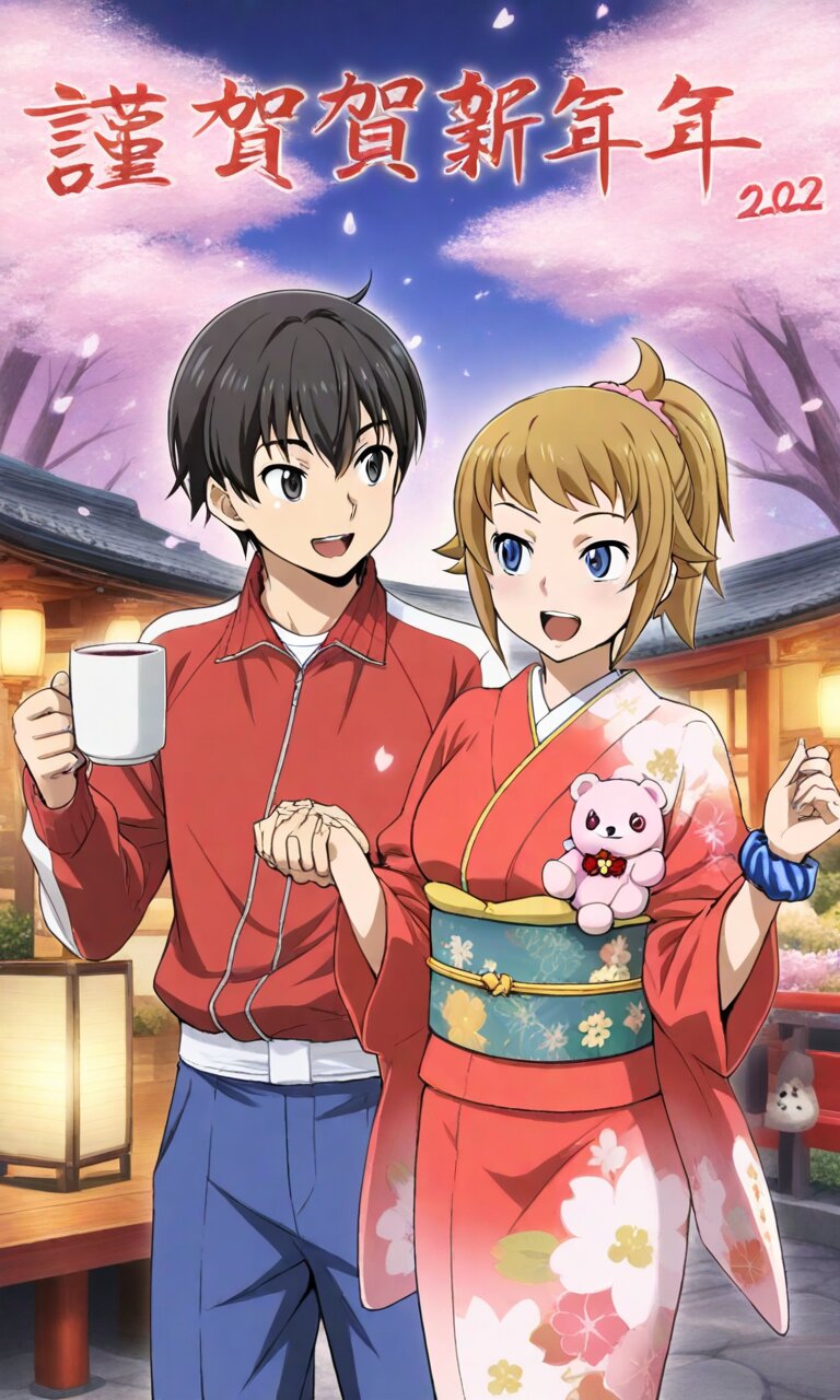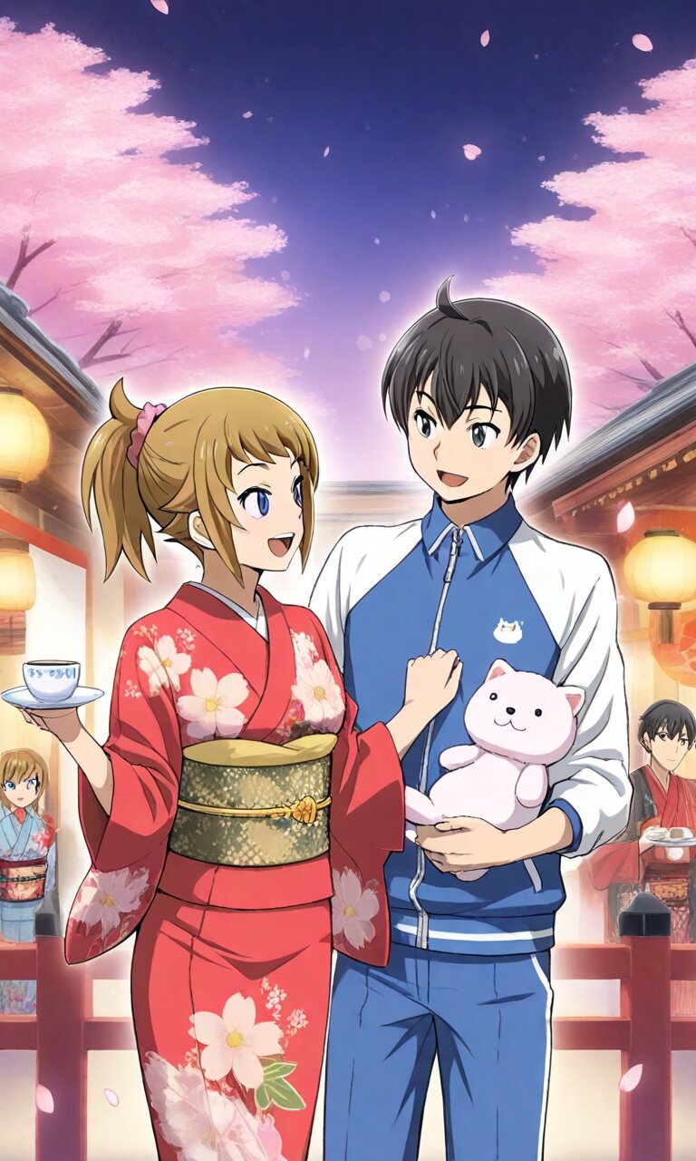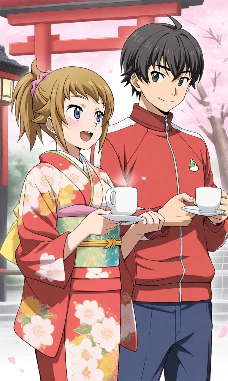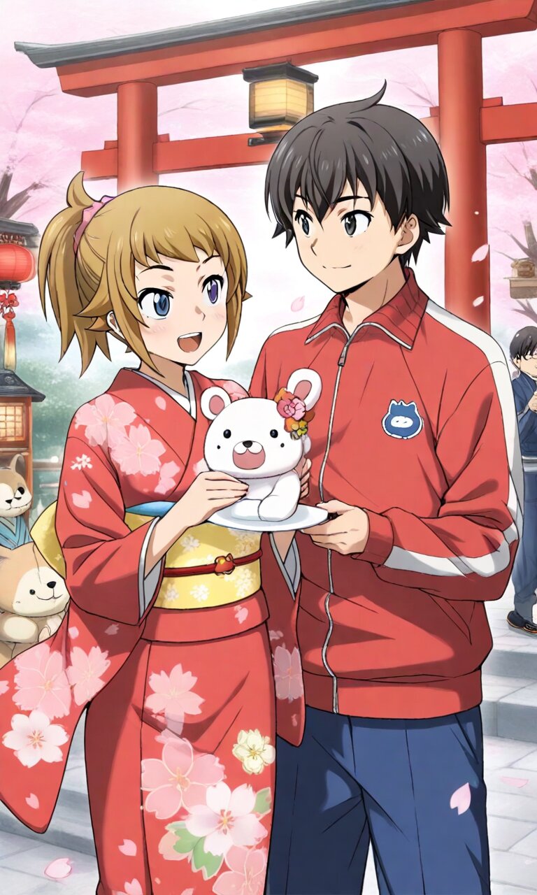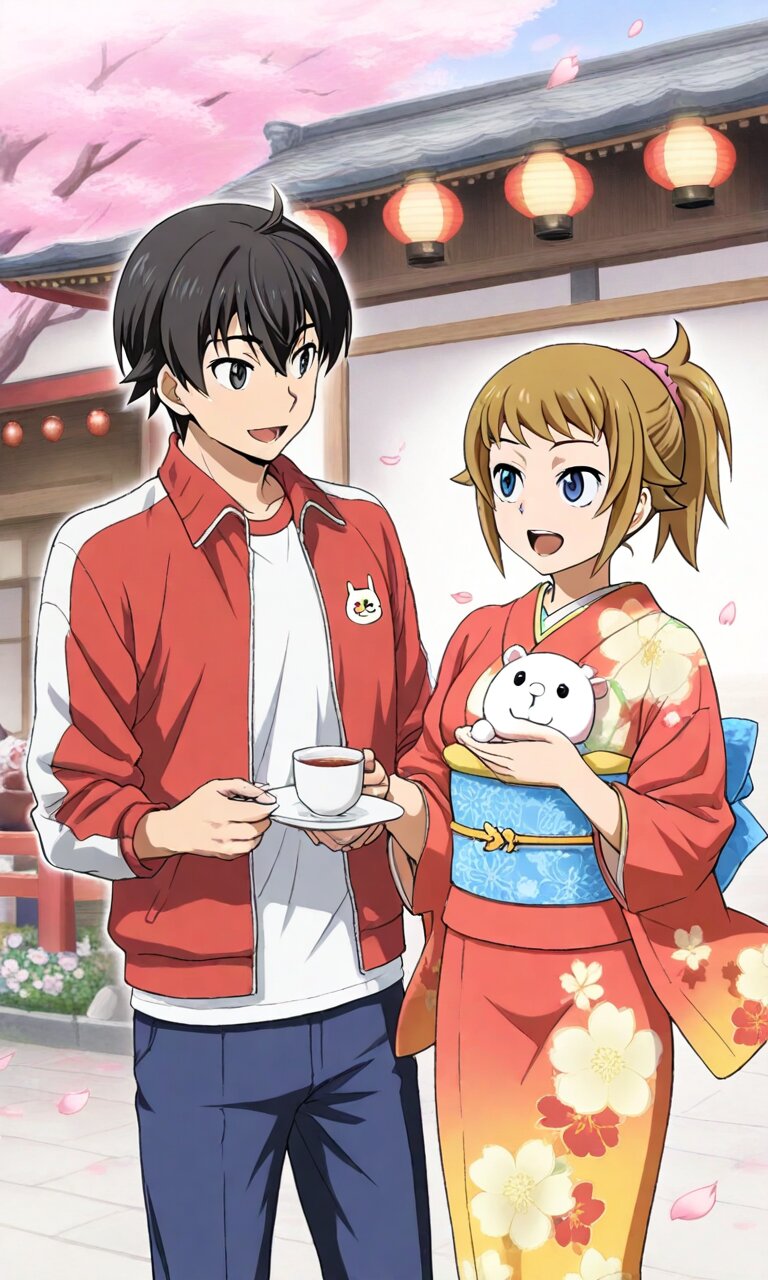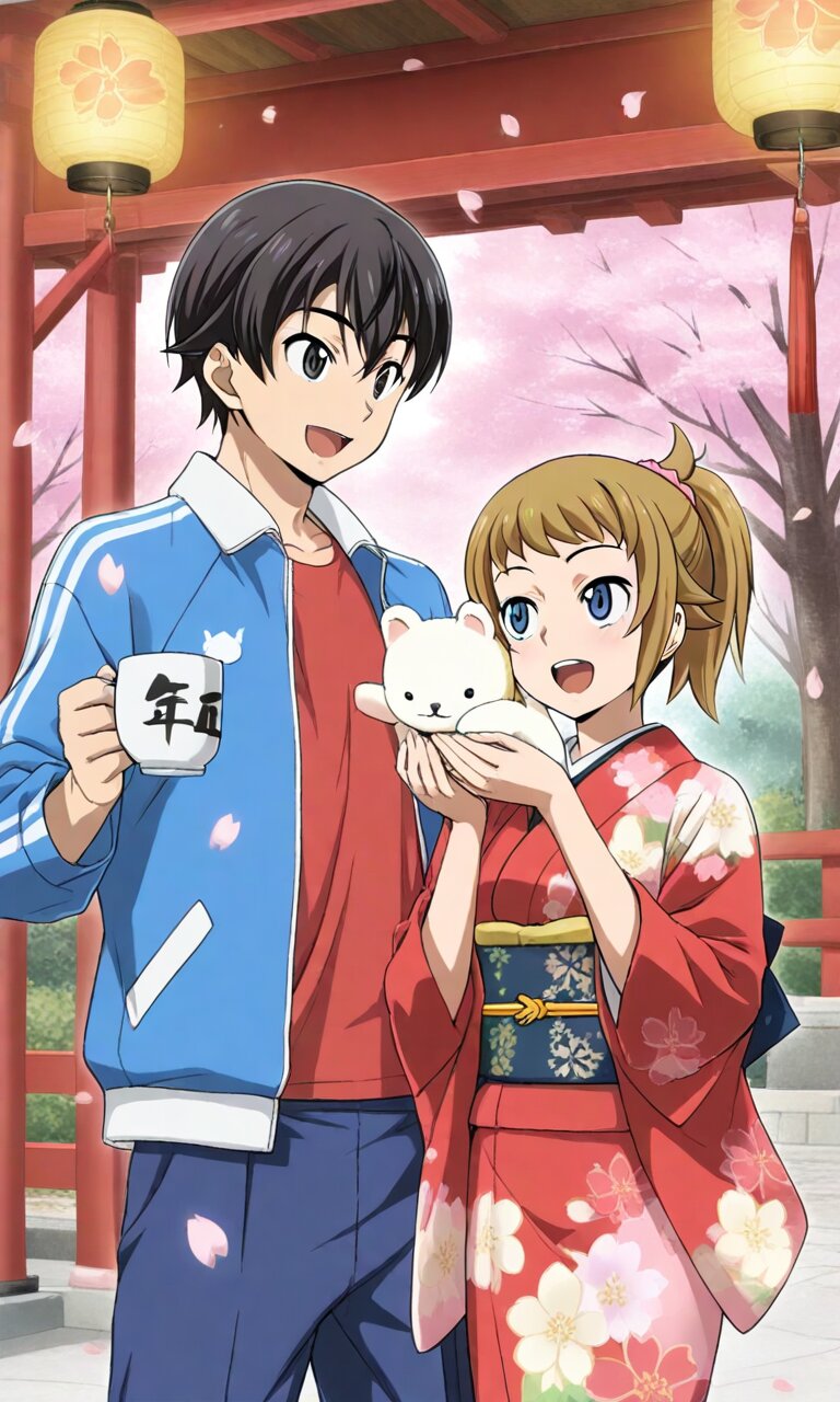 Couple, boy and girl, two people only,absurdres, ultra-detailed, master piece, high resolution, 8k, Boy, girl, couple, 1girl, smile, open mouth, holding, 1boy, jacket, standing, flower, japanese clothes, looking at another, kimono, hands up, cup, tree, sash, petals, jacket, animal, floral print, stuffed toy, obi, holding cup, cherry blossoms, blue pants, track jacket, mug, falling petals, lantern, print kimono, red kimono, collared jacket, holding animal, chinese zodiac, saucer, floral print kimono, kanzashi BREAK the boy(original boy,black hair,short hair, black eyes) BREAK the girl(1girl, solo, hoshino fumina, brown hair, short hair, hair scrunchie, pink scrunchie, ponytail, blue eyes, large_breasts, stomach, navel),