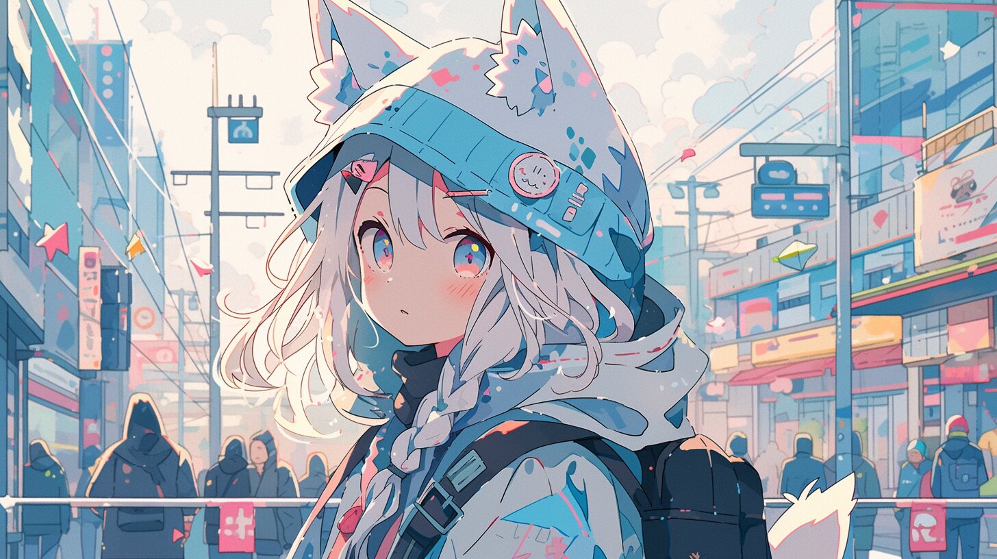 賑やかな朝の街路を、狐耳をフードに隠した少女が歩む。バックパックに詰めた秘密の地図を頼りに、失われた宝を探す冒険の始まり。通りすがりの人々が織りなす喧騒の中で、彼女の青い瞳は好奇心に輝く。もしかすると、次の角を曲がれば、予期せぬ出会いが待っているかも。日常の隙間に潜むファンタジーの瞬間を、想像してみて。
