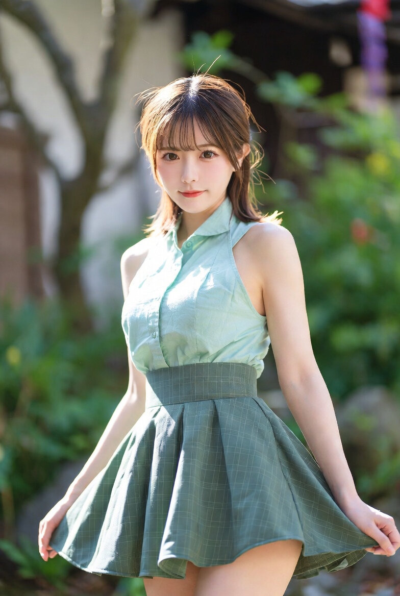 masterpiece, RAW photo, hyper detailed, extremely detailed CG, Japanese woman, 23yo, ((solo)), BREAK cute, pretty, hyper detailed eye, hyper detailed face, medium hair, bangs, extremely detailed, thin, tall, perfect anatomy, good proportion, extremely detailed body, perfect proportion, BREAK crop top,bare shoulders blouse colored mint green check short flare skirt colored leaf green, extremely detailed blouse and skirt, hyper detailed background,