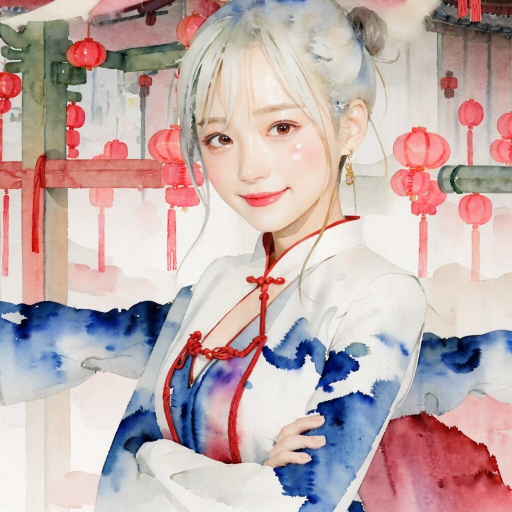 best quality, masterpiece, (watercolor painting:1.38), (line art:1.3), (illustration:1.2), (cel anime:1.1) Portrait,dramatic lighting, natural shadow, bokeh:1.5, japanese, 1 cute girl, smile:0.9, brown half updo, eyes detail, round face:1.2, (looking at viewer:1.2), (Chinatown in the rain:1.2), Chinese clothes, hanfu, sleeveless, rain, wet, Tears on cheeks:1.5, wind, japan text:1.2,