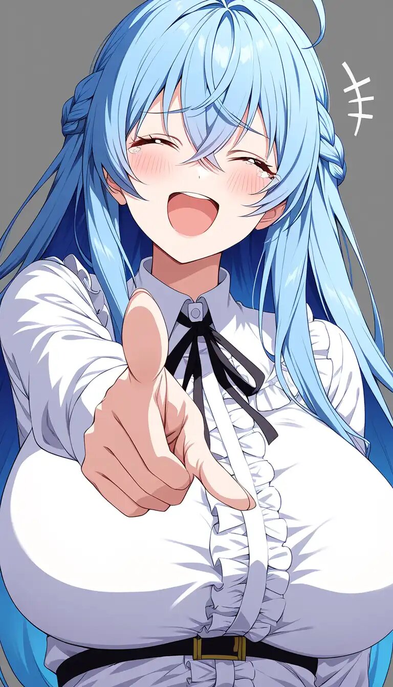 [masterpiece]++, [best quality]++, [ultra detailed]++, [8K]++, [laughing]++, [tears]++, [pointing at viewer]++, [closed eyes]++, [open mouth]++, [upper body]++, [+++]++, [simple background]++,1girl, solo, [huge breasts]++, perky breasts, hanging breasts, curvy, [blouse]++, long sleeves, [tall]++, [long hair]++, [straight hair]++, [shiny skin]++, [shiny clothes]++, blush,