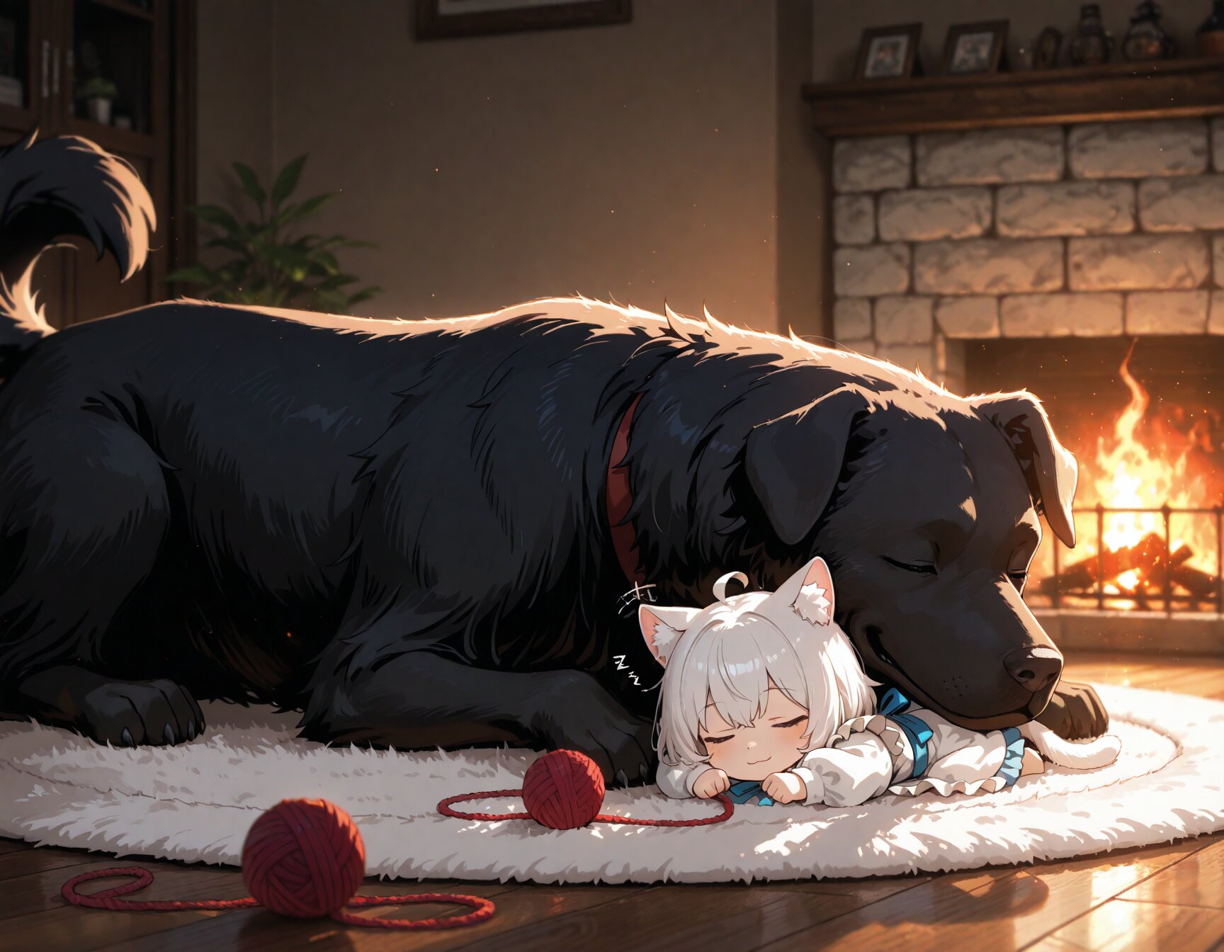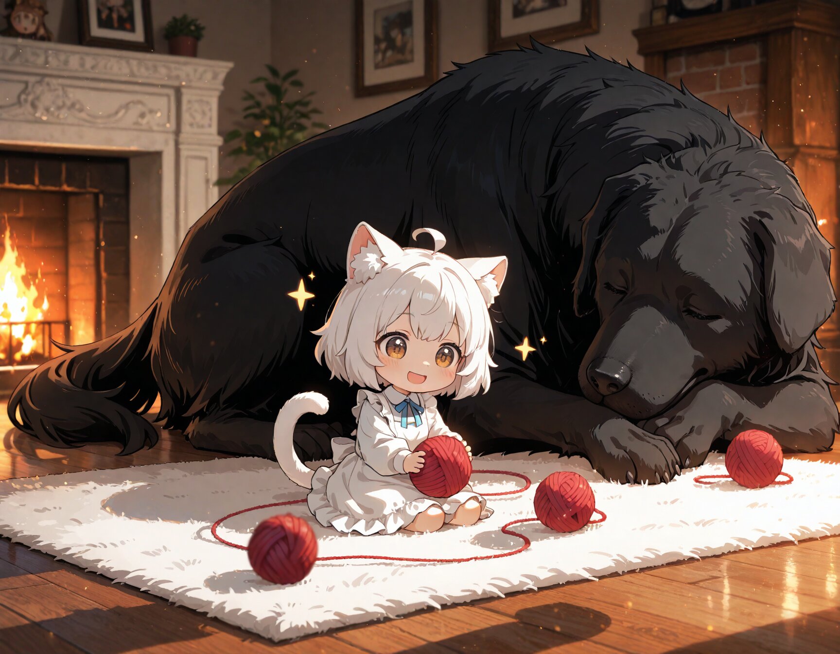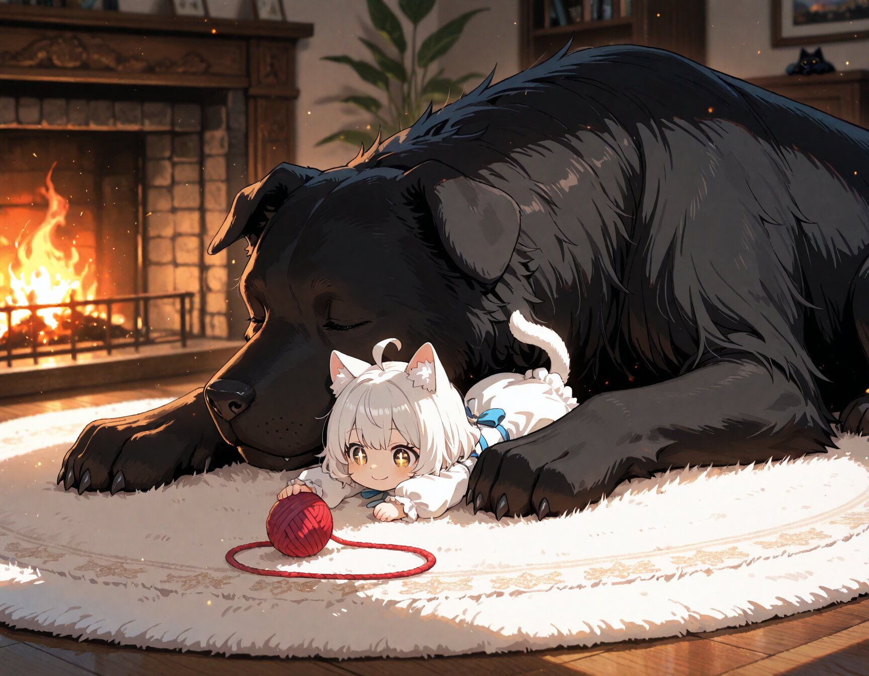 1girl and 1hige dog, (size difference:1.4), masterpiece, best quality, amazing quality, very aesthetic, high resolution, ultra-detailed, absurdres, dynamic anglem dynamic pose, close-up of a large sleeping black retriever, peaceful expression, soft fur texture, very tiny kitten girl sitting and playing, indoors, cozy room, wooden floor, warm interior, fireplace, lit fireplace, fire glow, warm light, rug, fluffy rug, yarn balls on floor, evening, soft shadows, floating dust particles. (white dress, white shirt:1.4), BREAK (loli, chibi), (very small girl), white cat girl, white hair, short hair, white cat tail, white shirt, white apron dress with many frills and ruffles, brown eyes, blue ribbon, cheerful energetic expression, happy smile, happy, playing with yarn, pawing yarn ball, crawling pose, sparkling eyes, BREAK (giant black dog:1.4), black retriever, lying, on stomach, labrador retriever, (huge dog), closed eyes, sleeping,
