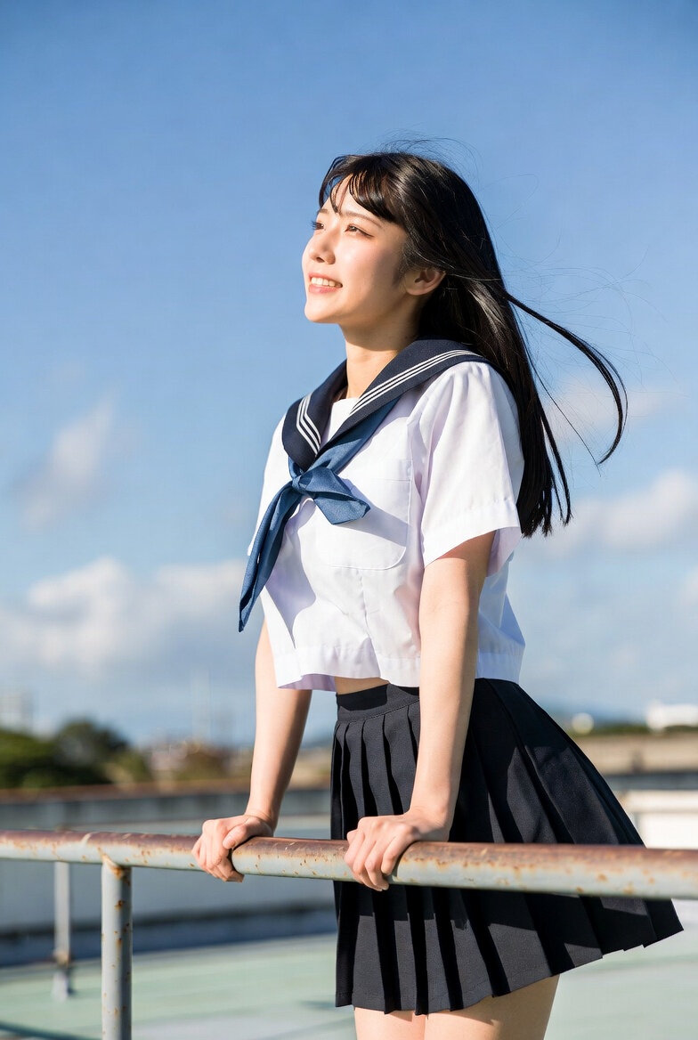 日本の女子高生、セーラー服、白い半袖夏服、紺のスカーフ、黒いプリーツスカート、膝上丈、屋外の学校の屋上に立っている、錆びた手すりに両手で寄りかかるポーズ、長い黒髪ストレート、風に少し髪がなびく、空を見上げる笑顔の表情、晴れた青空、夏の自然光、リアルフォト、詳細な肌の質感、photorealistic, masterpiece, best quality, natural lighting, shallow depth of field, 20歳の女性、清楚で少し儚げな雰囲気