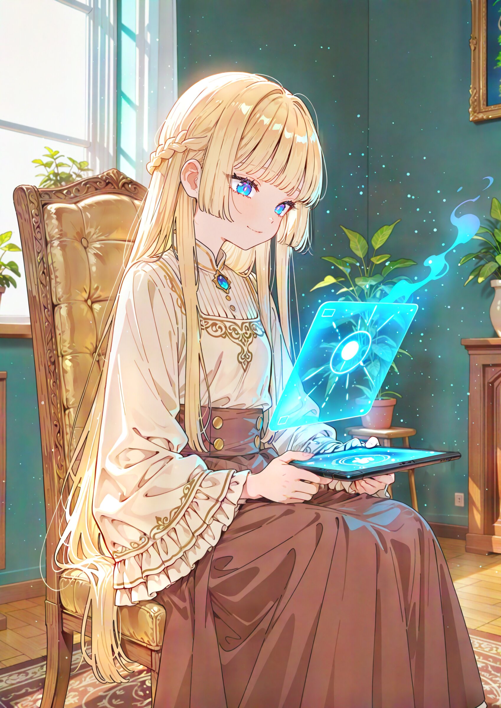 straight-on (upper body:1.1), knees out of frame from below, looking down looking ahead (flat chest, 1girl (13yo:1.1), very long hair, french braid, straight hair, hime cut, blond hair, blue eyes, closed mouth smile, overwhelmed expression, swamped, flooded, inundated, join hands together in prayer:1.0), winter atmosphere, Blackboard-style wall, high-back chair, island kitchen, wall planter, brown rug, analogous colors ivory blouse, frills, gold buttons, long skirt, , winter out of window holding tablet pc, floating holographic interface, depth of field, bokeh, dim lighting, afternoon, super fine concept art, hard surface, 8K, unreal engine, masterpiece, best quality, amazing quality, very aesthetic, absurdres, you can add scenery, (volumetric lighting), To make the background more distinctive. professional art lots of details, , overexposure, shiny-glistening, (watercolor style:0.0), (pastel color style:0.0) 4ur4_illu,shiny, glowing, glowing particles, glowing light particles, light particles, analogous colors ivory shadow , <lora:noline (1):-0.5> <lora:sdxl2-flat2-512b:0.0> <lora:facelightup_xl_v10:0.5> <lora:V2_yakumo_alchemy:0.2> <lora:Aura_illu:0.1>