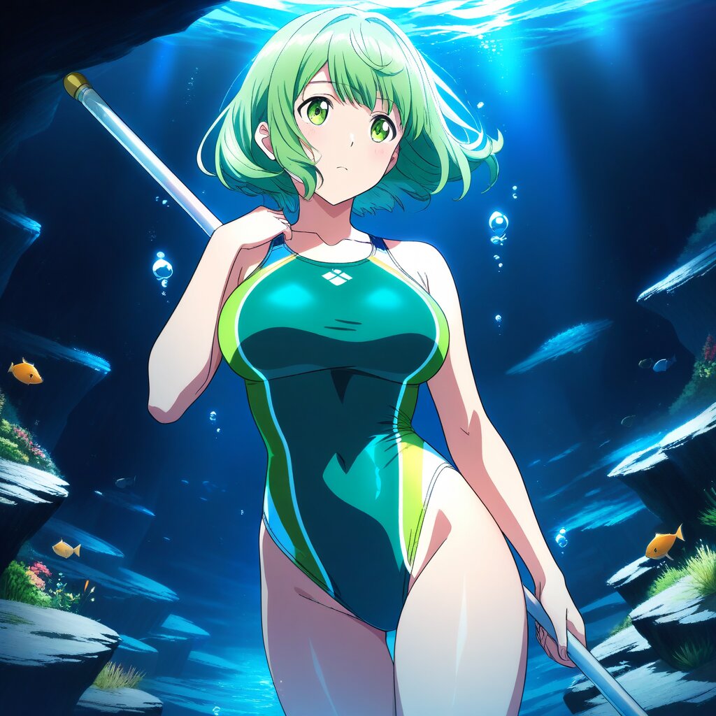 ((masterpiece)), ((best quality)), (ultra-detailed), anime style,cowboy shot, dark cave,underwater, submerged,a cute girl, 1girl, large bust ,(green competition swimsuit),a cute girl,large bust, short hair, green hair, carrying a staff on Back ,drifting underwater,hair floating freely,thinking