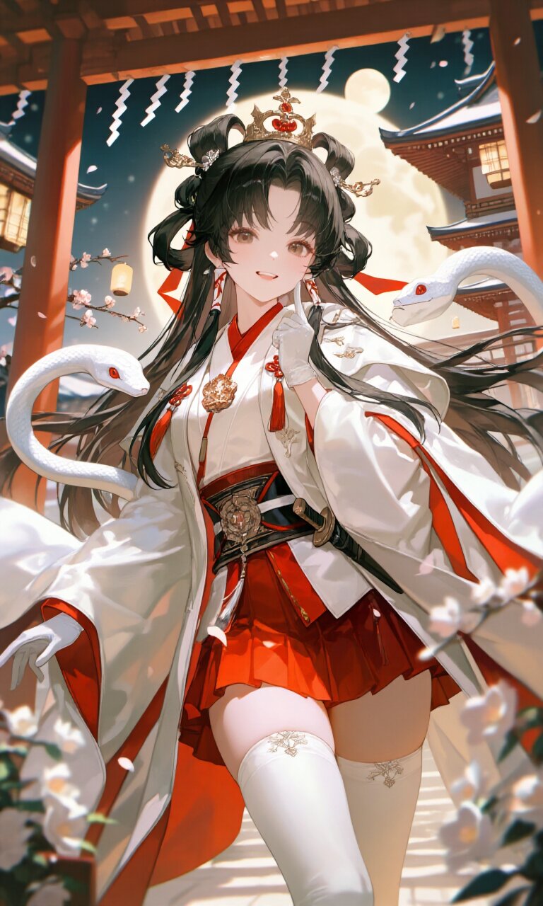 A 16-year-old girl with long, flowing black hair styled in a (perfect center part:1.8) and (parted bangs:1.8), adorned with hair rings and hair tubes, stands in a serene shrine setting under moonlight. Her delicate face features soft brown eyes, a warm smile, and a (cute pose), exuding charm and elegance. She wears a (Japanese style White Prince costume:1.6) with (wide sleeves past fingers), a (luxurious White Cape:1.3), and a (luxurious Red mini skirt:1.4). Her legs are covered in (luxurious White thighhighs:1.3), and her hands are clad in (luxurious White Gloves:1.3). A (Dagger on waist:1.3) and a (luxurious crown on head:1.4) complete her regal yet mystical appearance. A white snake coils around her arm, and sacred shide paper streamers flutter gently. The background features traditional Japanese architecture with wooden beams, lanterns, and blooming flowers under a soft, moonlit sky. The atmosphere is calm and romantic, with soft lighting enhancing the intricate details of her (detailed clothes), (detailed skin), and (delicate hair). The scene blends classic academia aesthetics with fantasy elements, creating a breathtaking, photorealistic masterpiece.
