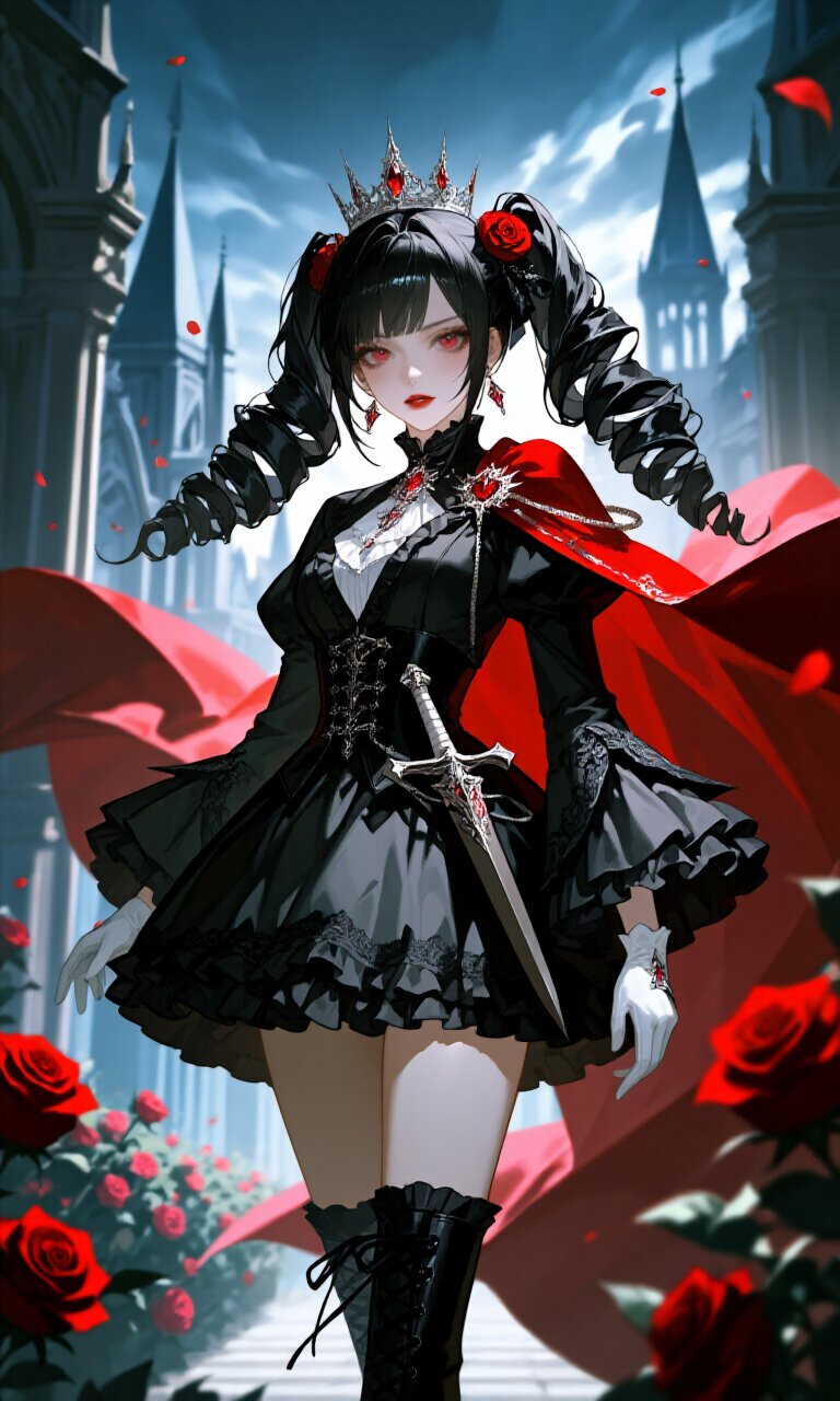 A stunning young woman with long black hair styled in elaborate twintails featuring (drill hair:1.5) stands in a majestic palace courtyard at midnight, gazing directly at the viewer with ((sharp eyes)) that gleam red like rubies. Her Gothic lolita style Black Prince costume consists of a (luxurious Black mini skirt with lace frills:1.4), (juliet sleeves) with intricate frills, and a (luxurious Red Cape:1.3) that billows dramatically behind her. She wears a (luxurious crown on head:1.4) adorned with jewels, matching her delicate hair ornaments and flower accessories. Her pale, flawless skin contrasts beautifully with her dark attire, accentuated by her red lipstick and subtle blush. A (Dagger on waist:1.3) hints at her noble status, while her (luxurious White Gloves:1.3) and (luxurious lace up Black Boots:1.3) complete the regal ensemble. The background features Gothic architecture surrounded by blooming red roses under a hazy night sky with drifting clouds, creating a romantic academia atmosphere with soft lighting that enhances the dreamlike quality of the scene. Every detail from her parted lips to the intricate lace patterns on her clothing is rendered with masterful precision.