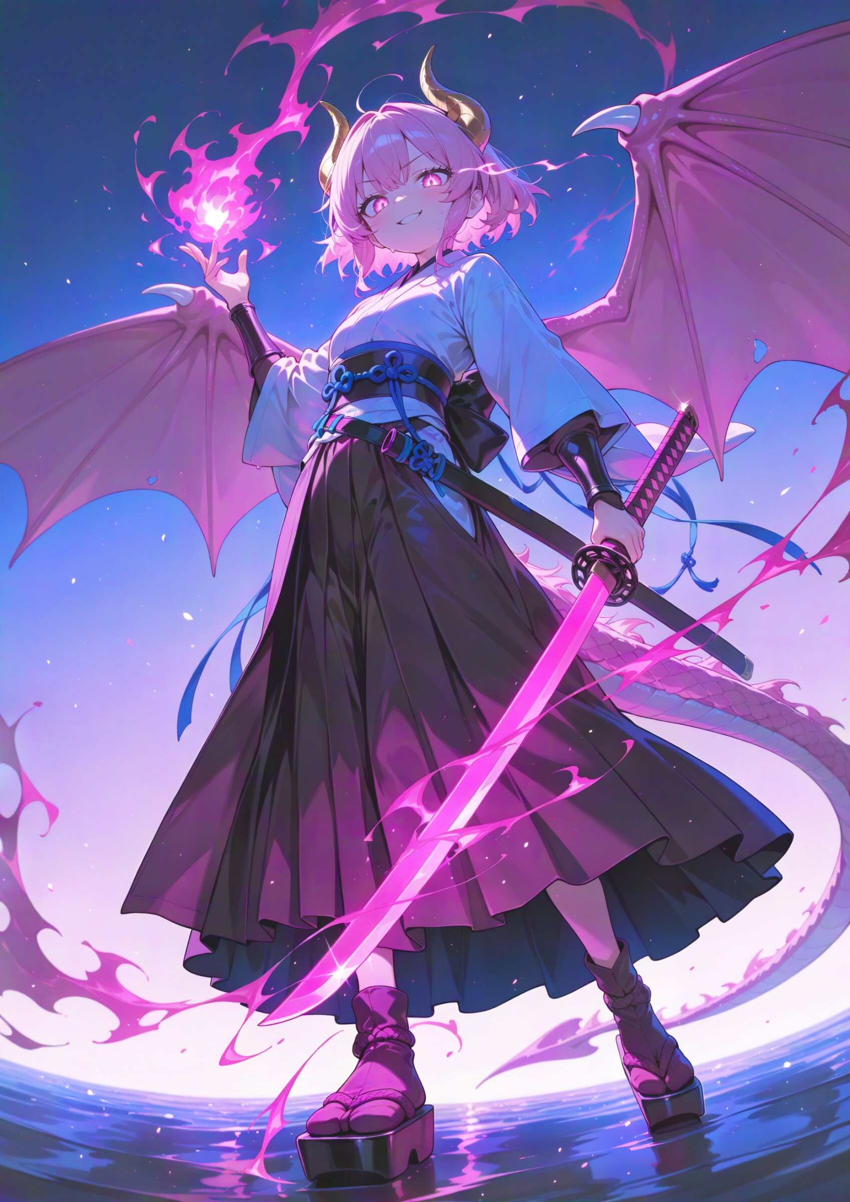 super fine concept art, hard surface, 8K, masterpiece, best quality, amazing quality, very aesthetic, absurdres, from behind, looking back, (fisheye,fisheye lens angle:1.0), (from below,looking down:1.2) looking at viewer, (dutch angle:1.2), autumn atmosphere. earthy color theme, impatiens (simple paper background:1.0), sumi-e, faux traditional media, color ink \(medium\), painting \(medium\), calligraphy brush (medium), monochrome, spot color, 1dragon girl, solo, from behind, thrust out one's hip, looking another, , dragon girl, 15yo, (2dragon gold horns attached to the head:1.2), (light pink hair:1.3), (doyagao:1.3), (wavy short hair:1.3), (beautiful pink eyes:1.3), cute, (muscle,buff well-built body,ultra-detailed muscle:0.4) , first-rate female body, perfect body, small breasts smart hips, a dragon tail (2long pink dragon wings on back:1.2), bracer, dark pink hakama,(overskirt:1.0) White Japanese Clothes , (White long sleeve:1.0), blue and white stripe obi, inner, straw sandals, tabi, fighting smile, eye trail, sweat drop, mesugaki smile, glowing japanese short sword, (japanese sword action:1.2), glowing sword katana obari pose katana glint, (swirling pink energy,energy magic,energy:1.2), glowing eastern dragon pink aura, The background is a solid, bright ivory, creating a striking contrast with the intricate, multi-colored design of the character, (standing silhouette:1.0), pop color background, (high saturation:1.2), autumn coloring, partly black ink wash effect, professional art lots of details, , overexposure, sumie effect style, 4ur4_illu,shiny, glowing, glowing particles, glowing light particles, light particles, purifying waters , <lora:noline (1):-0.5> <lora:sdxl2-flat2-512b:-0.2> <lora:facelightup_xl_v10:0.5> <lora:V2_yakumo_alchemy:0.5> <lora:Aura_illu:0.1>