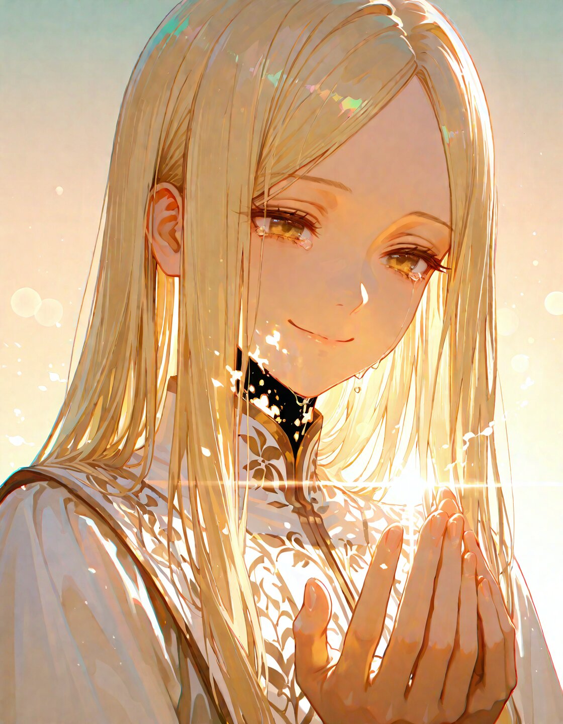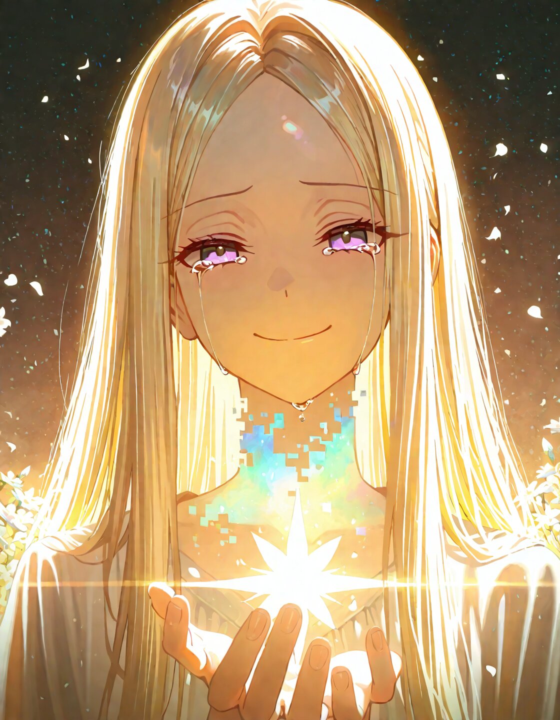 solo,1Girl,long hair,straight hair,blonde hair,(forehead:1.3),(center parted bangs:1.3),amber eyes,delicate face,delicate hair,beautifully detailed hair,defined detailed face,delicate face,beautiful detailed eyes,catchlight in eyes,masterpiece,best quality,insanely detailed,beautiful,16k,photorealistic, A sorrowful farewell scene,(a young girl with a melancholic smile fading away like mist:1.6),(disappearing before the eyes of the one she has always supported:1.5),her translucent form dissolving into the air, Her eyes filled with deep sadness,yet she gently whispers,"please forget that i was ever here.",the protagonist and quiet acceptance of fate reaches out in vain,unable to hold onto her,their hands passing through her fading figure, The atmosphere is filled with overwhelming nostalgia,A soft glow surrounds her as if she were made of light,with tears in eyes,scene of parting,hazy atmosphere,calm atmosphere,upper body,lens flare,glitch-noise,bloom,high-key lighting,soft lighting,dramatic lighting, out of focus,high brightness colors,blending into the twilight sky