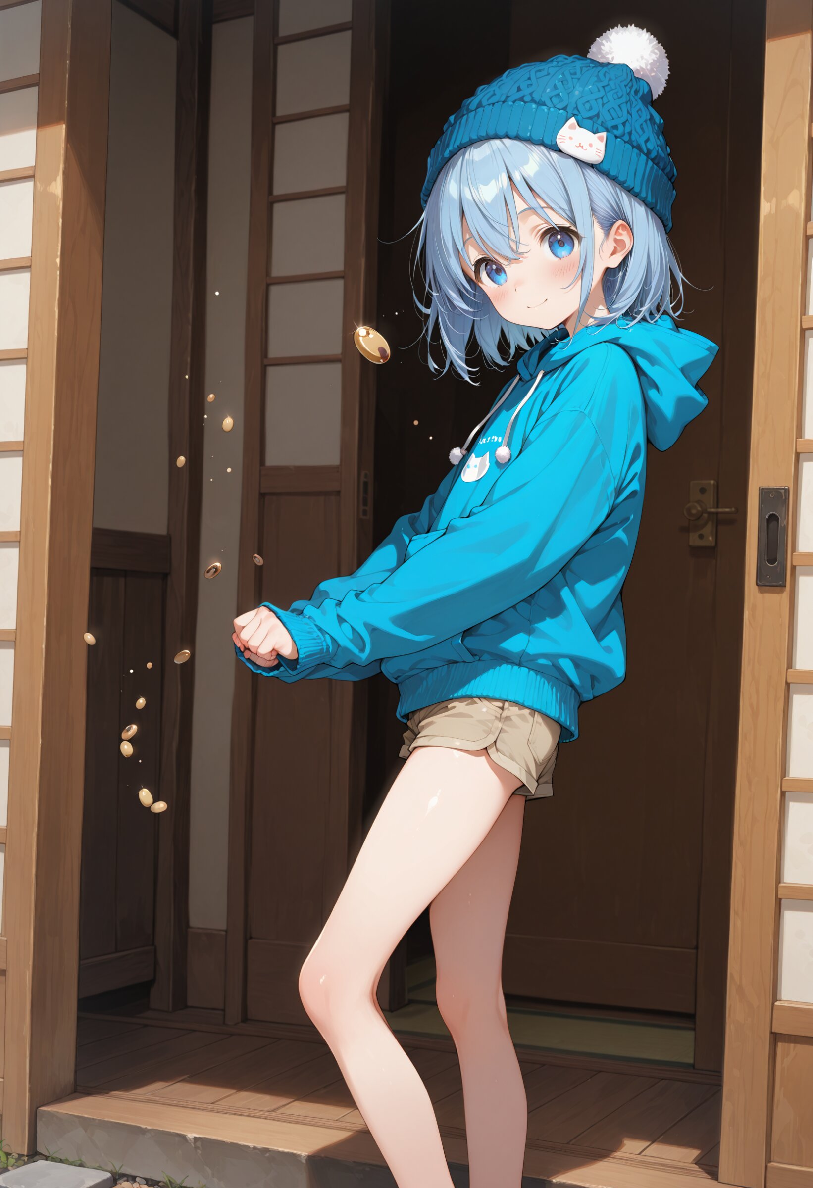 masterpiece, best quality, highres, ultra-detailed, extremely detailed, detailed, 1boy, shota, kawaii, light blue hair, medium hair, blue eyes, cat ear style knitted hat, blue hoodie, short pants, long sleeves, moe sode, Sleeves past wrists, slim legs, winter, entrance of the house, innocent expression, Japanese bean-throwing festival, (throwing beans:1.2), dynamic pose, happy, from side,