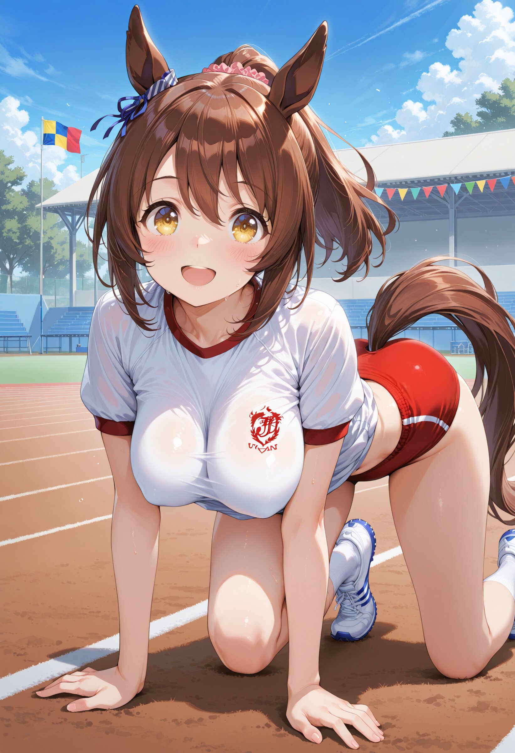 masterpiece, best quality, amazing quality, general, fine detail, official art, 1girl, loli, horse ears, horse tail, school gym uniform, high-cut buruma, midriff peek, beautiful brown hair, beautiful eyes, beautiful legs, big breasts, impossible clothes, perky breasts, athletic meet, Flag decorations for sports day, school ground, dynamic action, happy, quadrupedal Walking on all fours, look up, look at viewer, from front,