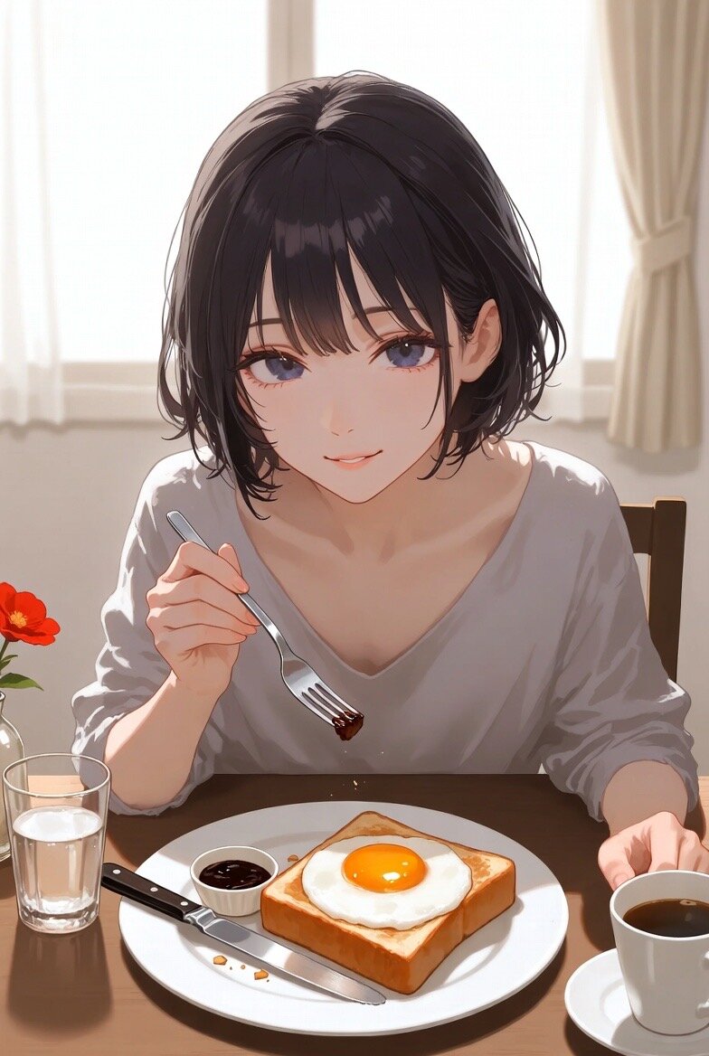 自宅で朝食をとっている日本人女性25歳のイラスト。トーストとコーヒーを楽しんでいる。