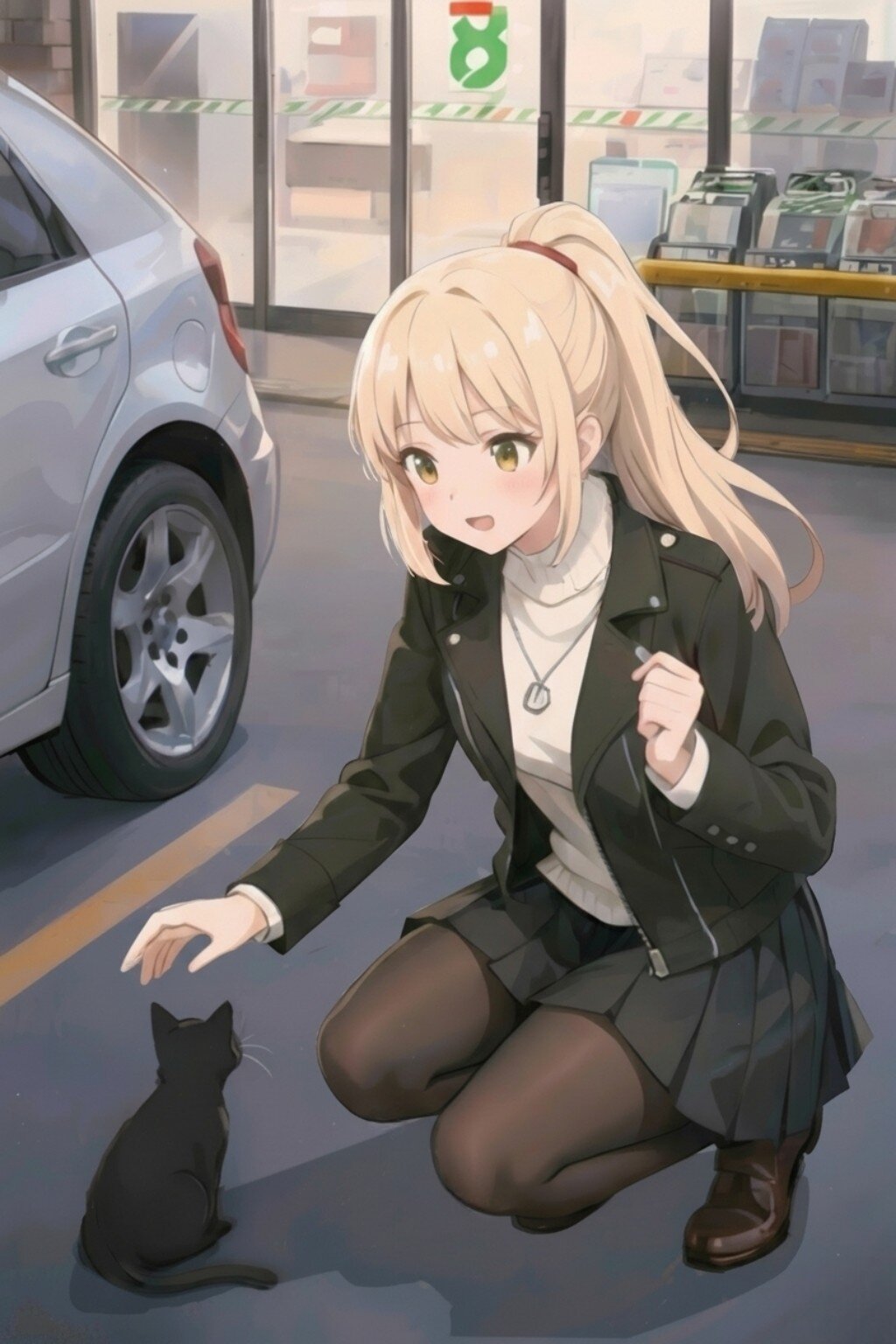 anime style, a young woman with blonde hair tied in a high ponytail, wearing a white turtleneck, a black leather jacket, and a black pleated skirt. She is crouching down and gently reaching out her hand towards a small black cat sitting on the asphalt. In the background, there is a silver car parked and a convenience store named "EIGHT TWILVE" with a green sign. The store has a large "8" logo on its glass door. The scene is outdoors during daylight, with a surveillance camera visible in the top right corner. The lines are smooth, and the image is clean with no visible noise.