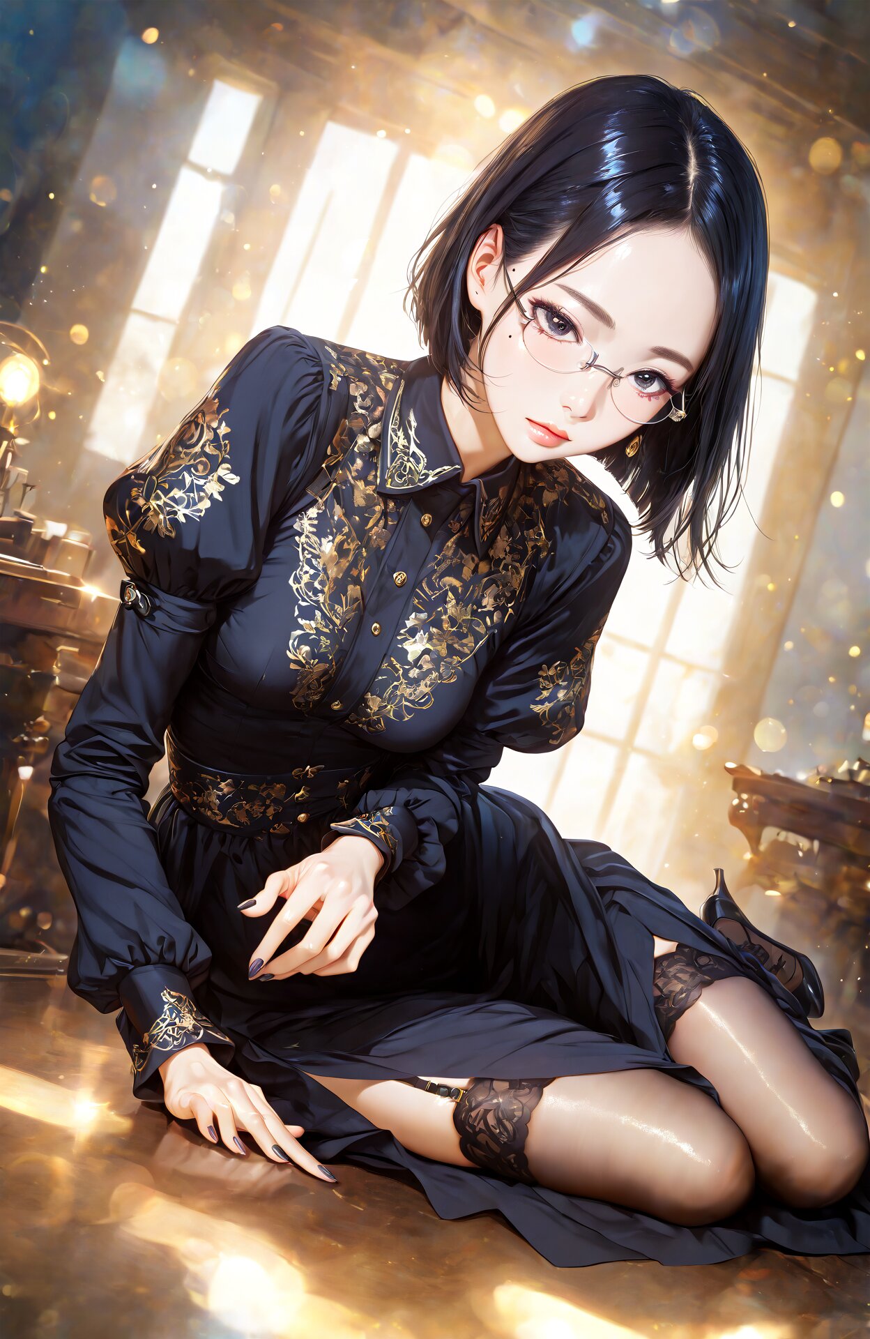 1girl, (full body:1.2100000000000002), (detailed embroidery shite stand collared blouse:1.2100000000000002), (white juliet sleeves:1.2100000000000002), (long sleeves:1.2100000000000002), pretty, young, gorgeous illustration, perfect anatomy, official art illustration, high res, 16k, ultra detailed cg, yokozuwari, dynamic pose, dynamic angle, dramatic lighting, dramatic shadows, pale skin, mole, mole under eye, detailed embroidery clothes, detailed black eyes, jet black hair, bob cut, blunt ends, forehead, no bangs, shiny hair, glossy hair, silky straight hair, detailed high waist leather very long skirt, black garter belt, black garter strap, shiny black embroidery garter stockings, detailed black ankle strap pin heels, cherry bloosom, bokeh, eyelashes, solo, lips, portrait, eye focus, nail polish, nose rimless18s, glasses, rimless glasses, Perfect hand, Detailed hand, kk sexybody 01 skindentation <lora:eyelashes_pony_V1.0:0.93> <lora:glasses_rimless_18s_SDXL_V1:0.74> <lora:Better hands - SDXL v2.0:0.8> <lora:kk_sexybody_01:0.65> <lora:skindentation pdxl_fp16:0.79>