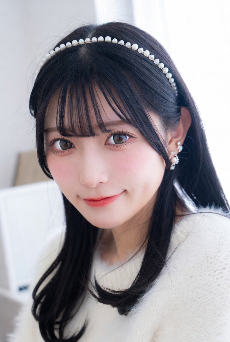 超美少女アイドル、20歳の日本人女性、大きなつぶらな瞳、ぱっちり二重、透明感のある白い肌、ほんのりピンクの頬、ナチュラルメイク、桜色の唇、長い黒髪ストレートにふわっとした毛先、前髪ぱっつん、眉上の厚めぱっつんバング、白いパールビーズの細いヘアバンド、キラキラした小さなパールとクリスタルのイヤリング、ふわふわの白いモヘア風ニットセーター、柔らかい質感、優しい微笑み、首を少し傾けてカメラを見つめる、正面寄り3/4顔、柔らかい自然光、明るい室内、白背景、最高品質、超詳細、リアルフォト、cinematic lighting、dreamy atmosphere
