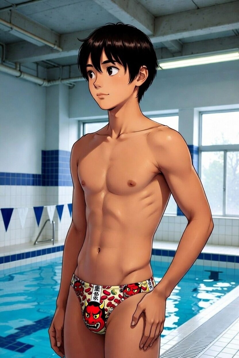 体育会系のシーンを生成しようと試行錯誤していた内のひとつ。水泳部員。水泳部員の練習用の水着っておよそ派手なカラーやプリントが多い。以前雪柄を制作した。https://iromirai.jp/posts/6115868335a0