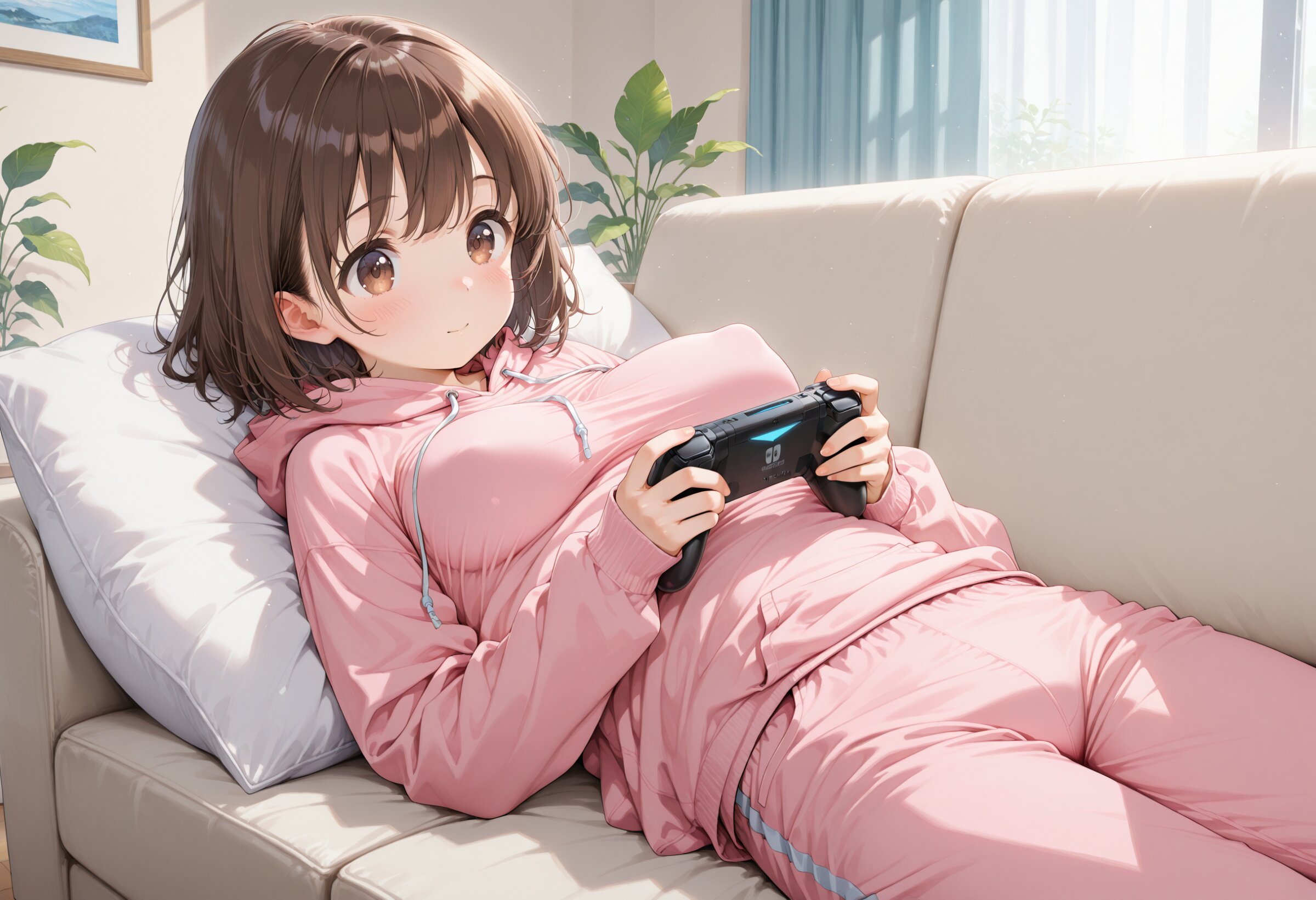 masterpiece, best quality, amazing quality, general, fine detail, official art, 1girl, loli, brown hair, brown eyes, short length light pink hoodie, light pink short room pants, big breasts, (perky breasts:1.2), impossible clothes, long sleeves, moe sode, Sleeves past wrists, Carpeted living room, playing video games, lying, relaxing, happy,