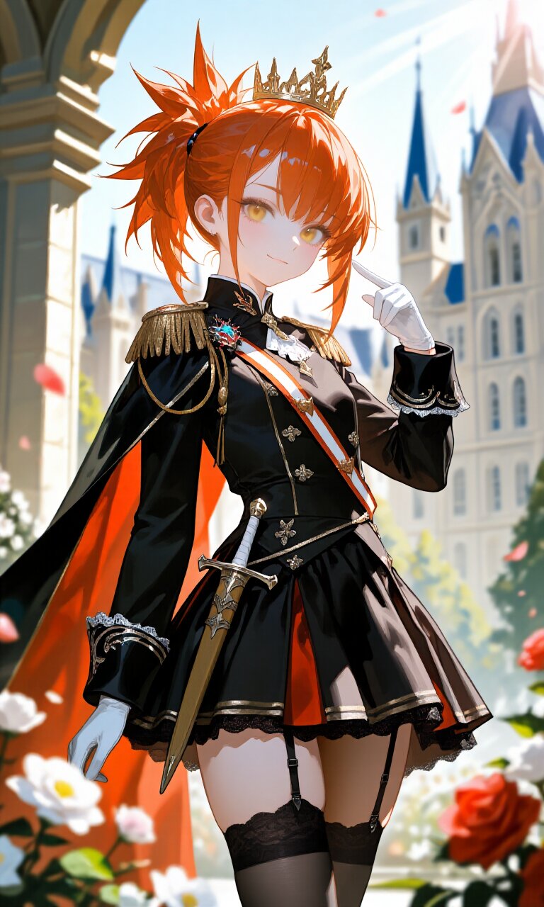 solo, 1girl, A 10-year-old girl with bright orange hair styled in a spiked ponytail and asymmetrical bangs, possessing slanted yellow eyes and a delicate, petite frame with a flat chest, narrow waist, and slender hips and legs. She wears an intricate, luxurious black Prince costume with long sleeves, a flowing cape, a lace-trimmed mini skirt, black thighhighs secured by a garter belt, and pristine white gloves. A decorative dagger is sheathed at her waist, and a ornate crown rests upon her head. Her expression is a light, charming smile, and she strikes a cute, confident pose with detailed fingers. The setting is outside a grand palace with Gothic architecture, surrounded by blooming flowers in the soft afternoon sunlight. Sunbeams filter through the air, creating a gentle lens flare and a light, romantic academic atmosphere. The image is rendered in photorealistic detail, emphasizing meticulous textures in her hair, skin, and clothing, achieving a masterpiece quality with insanely detailed, beautiful clarity.