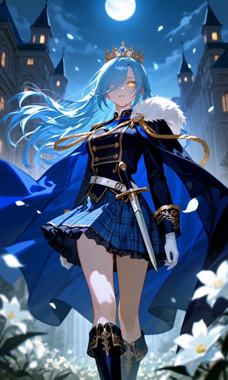A 15-year-old girl with long, flowing blue hair and glowing yellow eyes stands confidently in a moonlit palace garden. Her sharp, big eyes peer intensely from beneath her hair, which cascades over one eye in an elegant sweep. She wears a (luxurious Darkblue Prince costume:1.6) with intricate gold embroidery, complete with long sleeves and a (luxurious Darkblue Cape with gold trim:1.3) that billows dramatically in the wind. Her outfit includes a (luxurious plaid blue mini skirt:1.4) paired with (luxurious Darkblue Boots:1.3) and (luxurious White Gloves:1.3). A gleaming (Dagger on waist:1.3) rests at her hip, and a (luxurious crown on head:1.4) adorns her head, catching the moonlight. Her delicate face features parted lips and flawless, detailed skin, exuding both youthful charm and regal poise. The retrofuturism palace architecture looms behind her, blending classic academia with romantic fantasy. The hazy midnight atmosphere is filled with floating petals and glowing flowers, illuminated by the soft glow of the moon. The wind tousles her hair and cape, creating a sense of dynamic movement within the calm, ethereal scene. Every detail - from the fabric textures to the individual strands of hair - is rendered in photorealistic 16k quality, making this a true masterpiece of insanely detailed beauty.