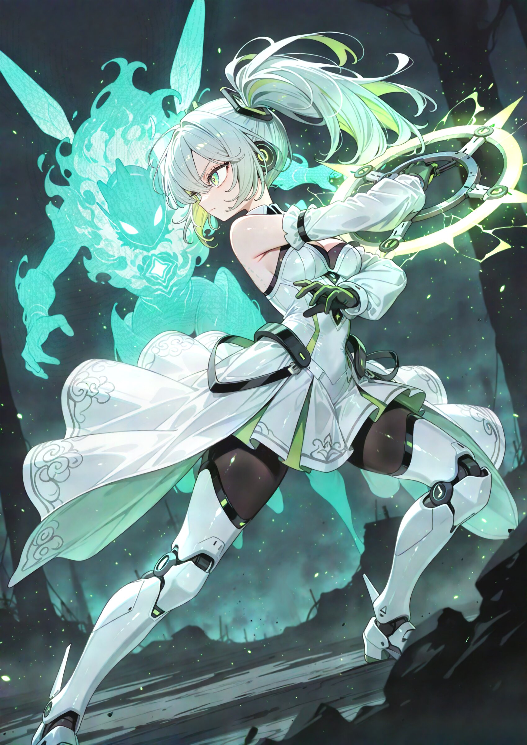 1girl, huge cool chakram in hands, holding huge cool weapon mechanism, machine, ,profile (battle:1.2), (looking away:1.0), from side, turning head (huge pastel colors green silhouette of Bee,serious monster silhouette:1.2), the nether world, dark land, dark field, hell,, blurry background, fighting, duel, incoming attack super fine concept art, hard surface, 8K, masterpiece, best quality, amazing quality, very aesthetic, absurdres, professional art lots of details, , overexposure, shiny-glistening, (watercolor style:0.0), (pastel color style:0.0) 4ur4_illu,shiny, glowing, glowing particles, glowing light particles, light particles, <lora:noline (1):1.0> <lora:sdxl2-flat2-512b:0.0> <lora:facelightup_xl_v10:0.5> <lora:V2_yakumo_alchemy:0.5> <lora:Aura_illu:0.1>