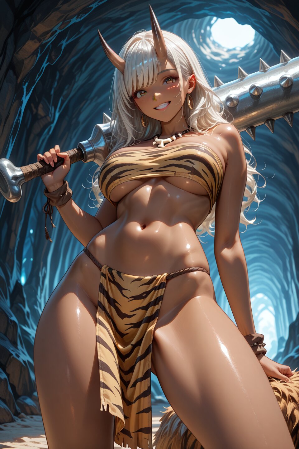 (gaze at me with an Mischievous face smile), moe heroine, sharp focus, nice hands, perfect hands, perfect anatomy, perfect structure, (theme is Cave Dwellers), ((1girl solo)), (Deep in a dim cave), (On a Morning, the girl is stands on fur-rug, gaze at me with Mischievous Smile), indoors, cowboy shot, from below, low angle, spread leg, (Japanese Oni holding a gigantic black spiked iron club, heavy metal studs, textured iron, traditional Japanese style). ultra detailed lips, ultra detailed face and hair, she is Elegant, Graceful. oni woman, golden eyes, (dark skin:1.4), dark-skinned female:1.4, (shine silver hair:1.3), large breasts, wide hip, loincloth, primitive loincloth, primitive, prehistoric clothes, bone necklace, tiger print, prehistoric tube top, tiger print loincloth, cavewoman, oni horn,, anime style, anime color,, <lora:elf-san_alpha1(AnimagineV31):0.7> <lora:Elf-san_alpha7(IL2.0):0.7>