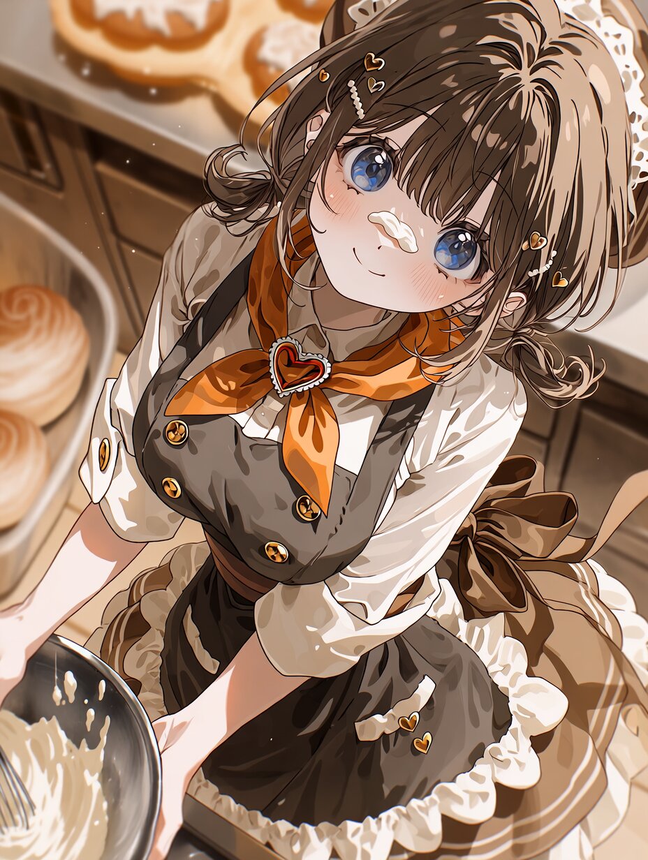 quality:from abobe,looking down from abobe,close up to face,Masterpiece, best quality, ultra detailed, depth of field,high resolution. character:1girl, brown shorthair,low twintail,dark blue eyes.fashion: brown and white cafe maid-themed outfit, (fitted dark brown apron dress with gold double-breasted buttons:1.2), crisp white long-sleeve blouse worn underneath, neatly rolled-up sleeves with clean cuffs, soft orange neck scarf tied at the collar, (heart-shaped jewel brooch at the center:1.2), white lace trim along the skirt hem, (large brown ribbon bow tied at the back waist:1.1), brown and white maid headscarf, cute heart-shaped hairpins,background: In the patisserie kitchen, she stirs meringue in a bowl with a whisk; sponge cakes sit on the countertop, White meringue on the nose, watching the audience, smile,action,pose,dynamic angle, --s 500 --niji 7 --no 3D figure