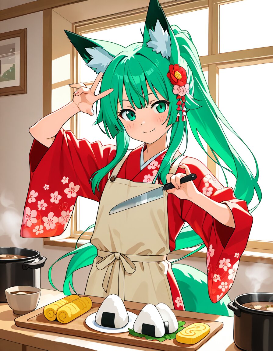 masterpiece, best quality, ultra detailed, anime style, 1girl, cute flat-chested girl, mint green long hair high ponytail, delicate kanzashi, fluffy fox ears and tail, casual red kimono with small floral patterns, cozy kitchen, morning sunlight streaming through window, golden rays and soft backlight, standing at counter chopping vegetables on cutting board with fresh veggies, holding single kitchen knife in one hand mid-chop, other hand making cute fox hand pose sign, fox gesture with fingers, nearby steaming miso soup pot separate, onigiri rice balls on plate, tamagoyaki rolled omelet on plate, breakfast items arranged separately, dynamic focused pose, determined gentle subtle smile, warm vibrant atmosphere, detailed counter setup, kawaii, (chopping veggies with one knife:1.3), (fox hand pose with free hand:1.35), (morning sunlight through window:1.3), (single knife only:1.4), (steaming miso soup pot separate:1.2), (onigiri and tamagoyaki on separate plates:1.2)