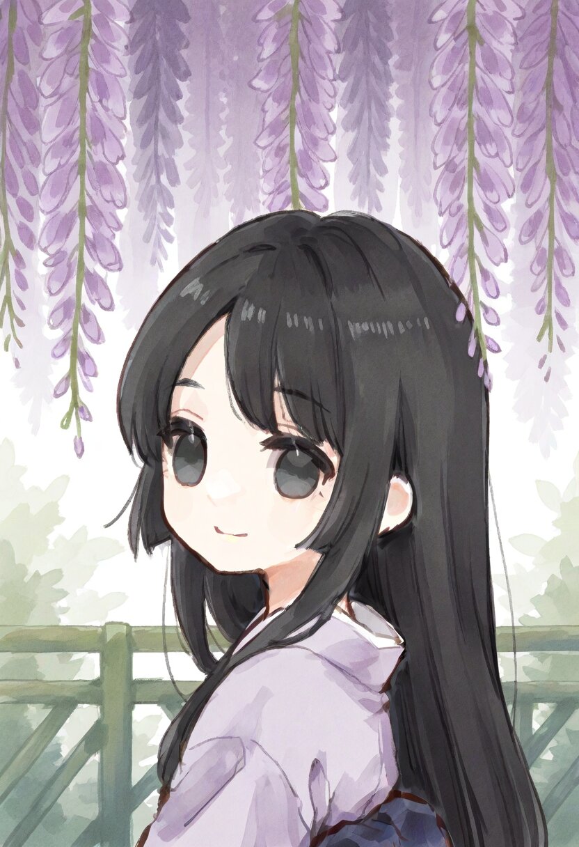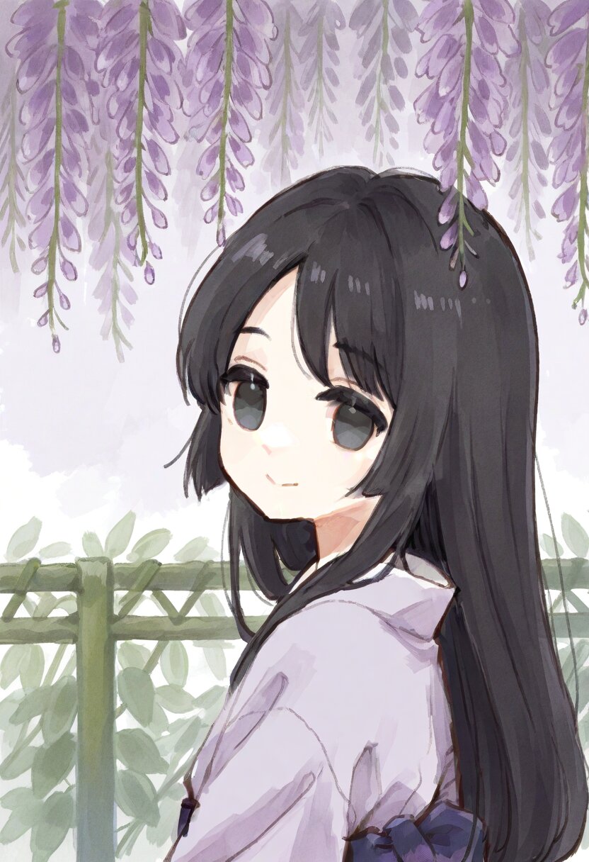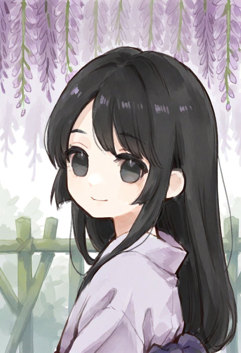 <lora:inmnstyleilxl:0.9>, chibi, solo, 1girl, wisteria trellis, look back, upper body, pale purple kimono, black hair, long hair, black eyes, smile, ultra-detailed, best quality, masterpiece, very aesthetic, watercolor painting, general