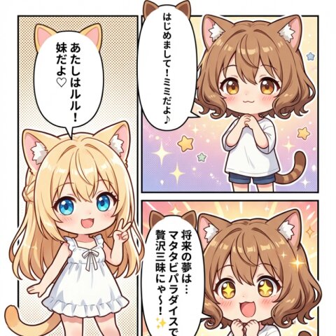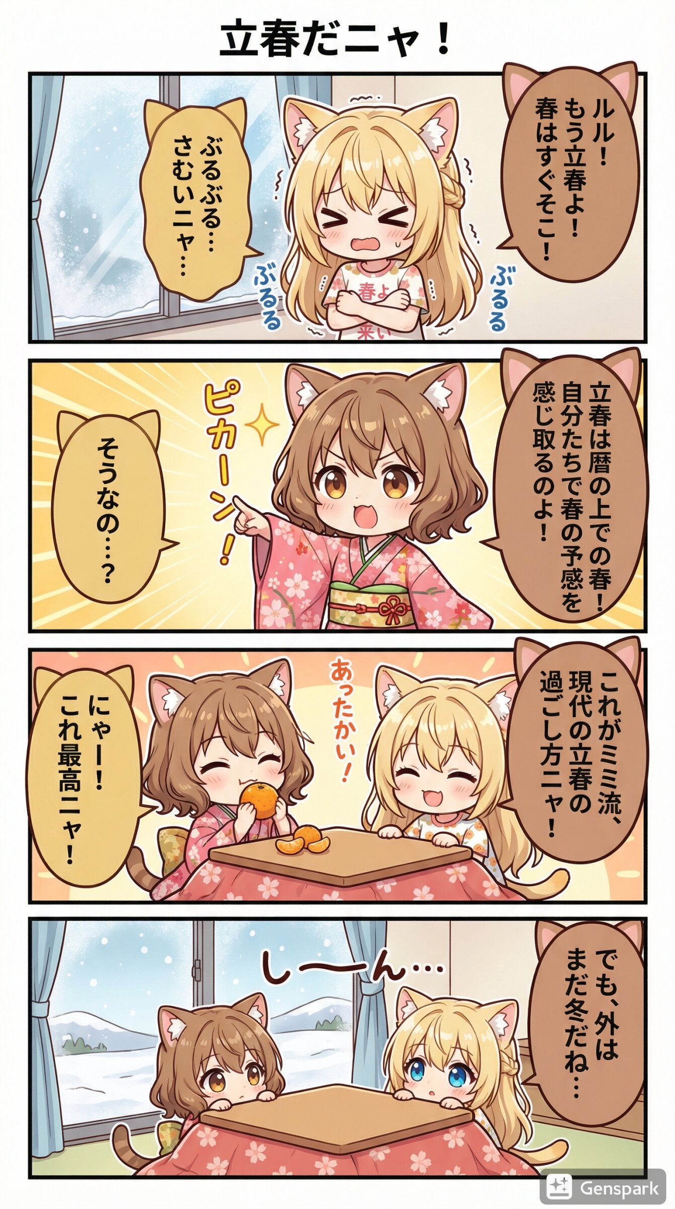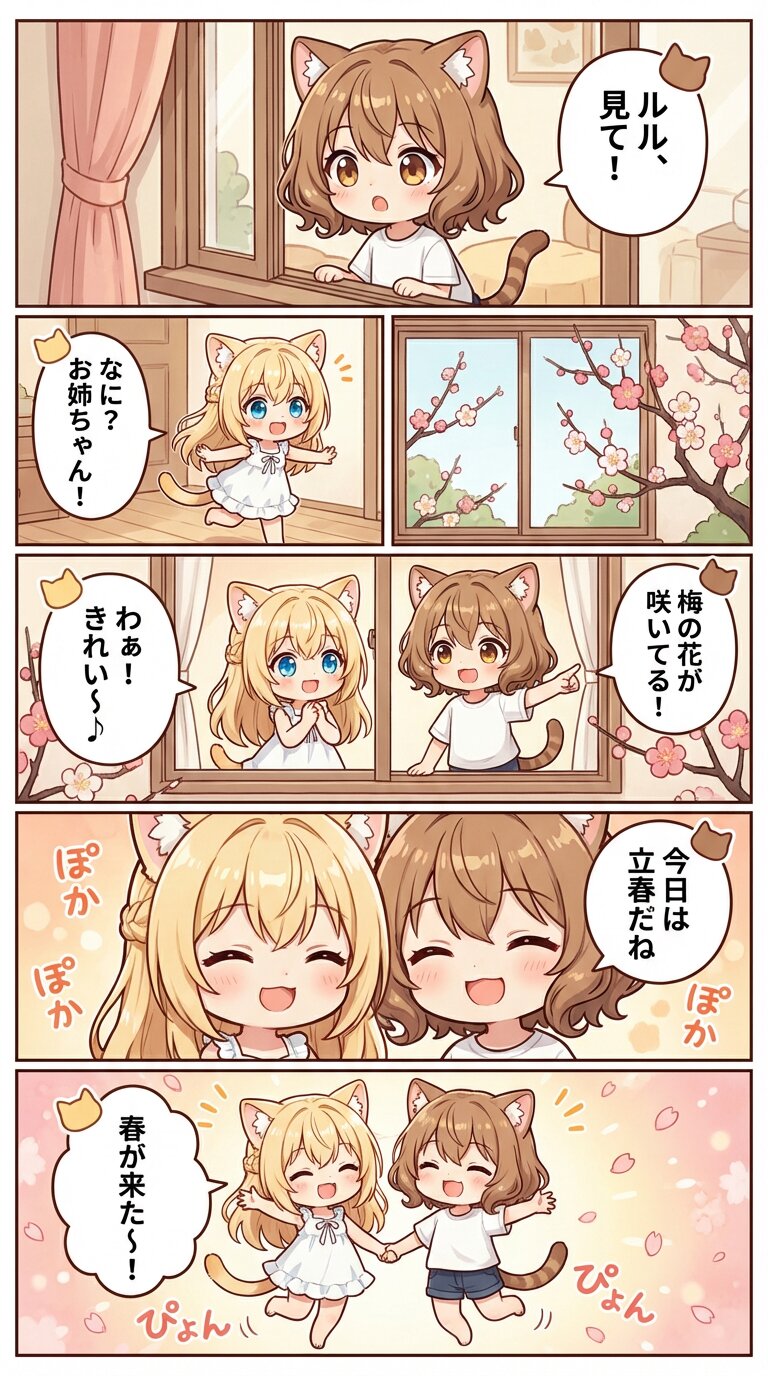 「立春」をテーマに、茶髪猫耳娘(姉)の「ミミ」と金髪猫耳娘(妹)「ルル」が登場するユニークな短編カラー日常漫画を作って。 セリフやオノマトペはすべて日本語。 それぞれの吹き出しにキャラに合わせて茶髪の猫耳と金髪の猫耳をつけて。 右から左へ読むことを前提としたセリフ配置。 キャラの服は内容に似合うものに着替えさせて。 服がTシャツの場合は感情に合わせた柄にして。